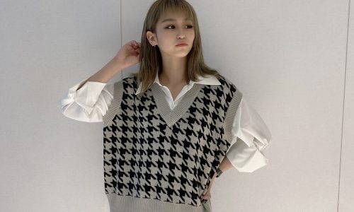 VネックアウトシームニットをOP風に着て