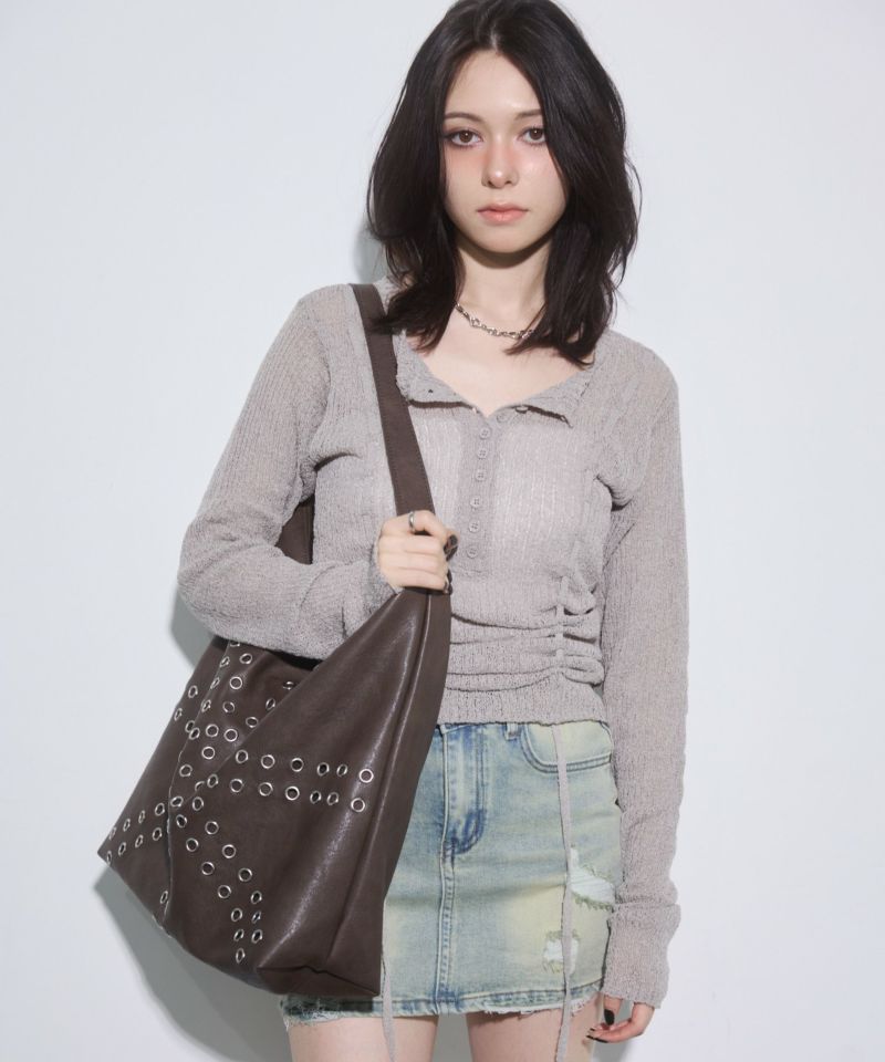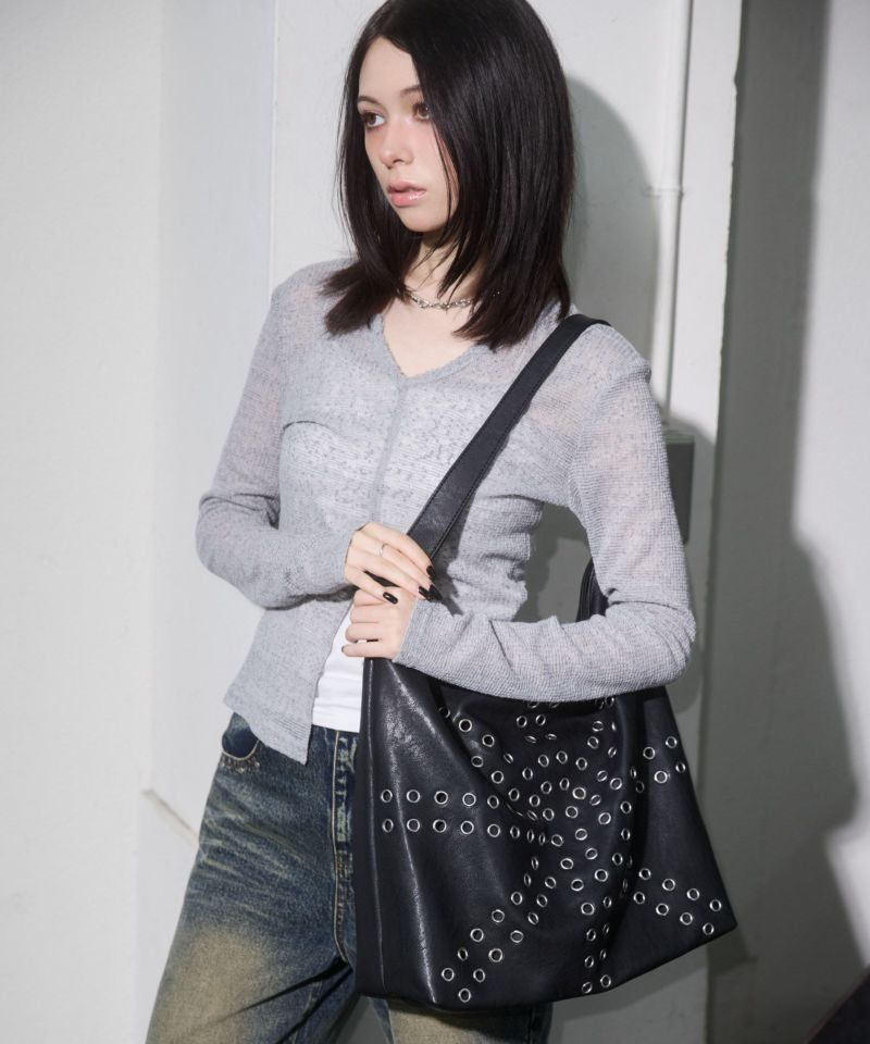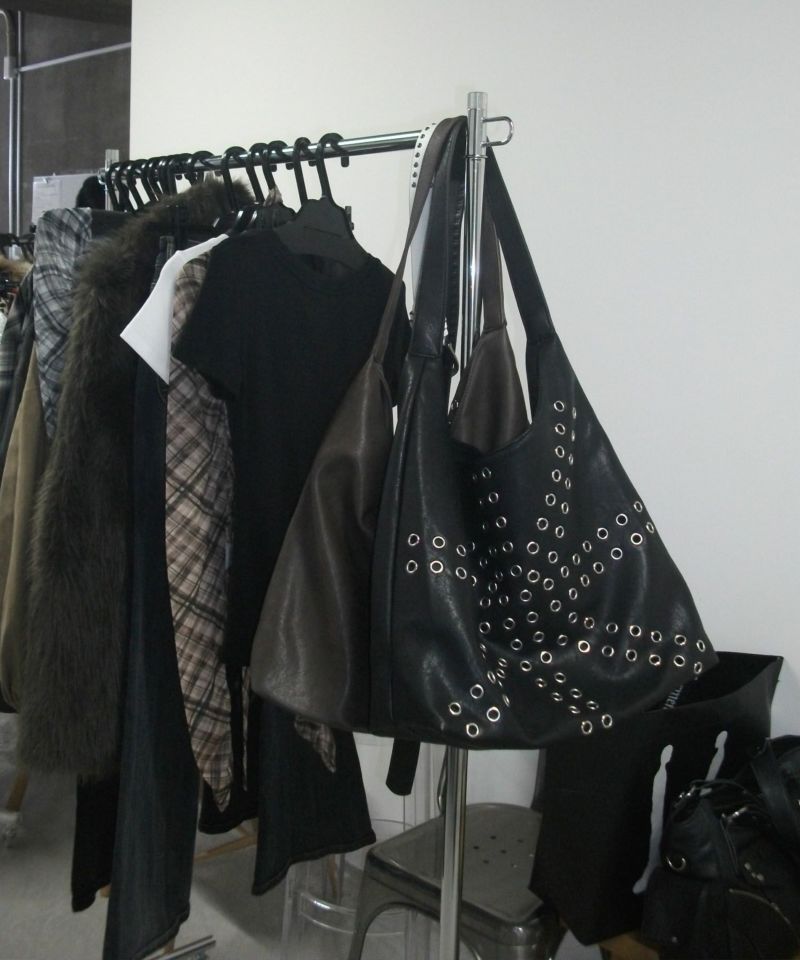 -------------------------------------------------- ■ディティール アイレットデザインがエッジが効いておりスタイリングのアクセントになるバッグ。 大きめのサイズ感で大容量なのも嬉しい。 中には内ポケットが2つ付いており、実用性もばっちりです。 --------------------------------------------------