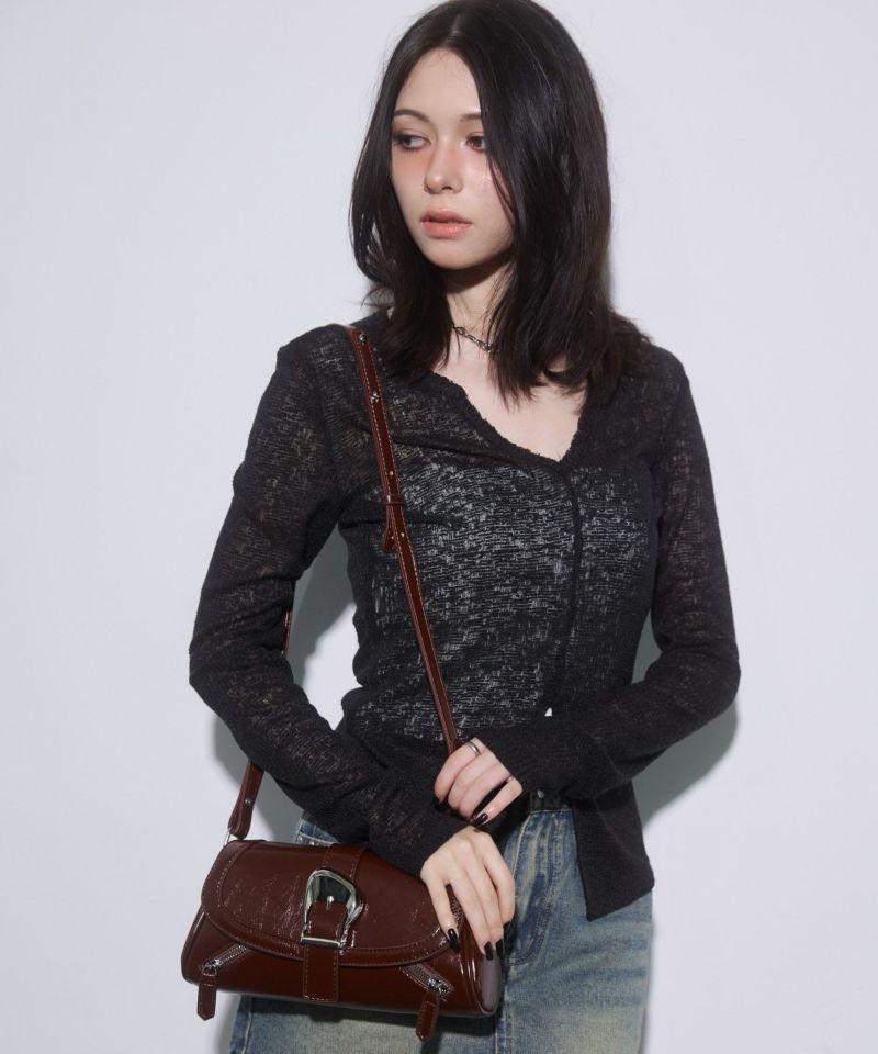 -------------------------------------------------- ■ポイント 光沢のあるレザーが高見えなバッグ! ■ディティール 大きなバックルが目を引くショルダーバッグ。 コンパクトながらも横幅とマチがしっかりあるので見た目以上に物が入ります。 ファスナーデザインがアクセントになっています◎ --------------------------------------------------