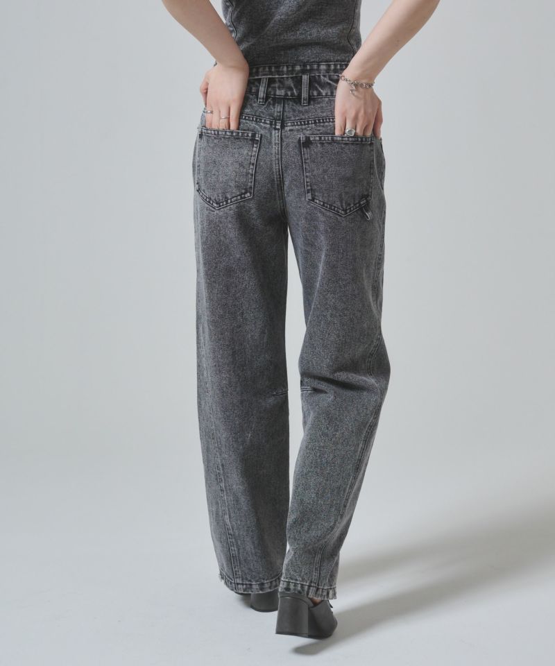 脇線をカーブさせたり、後ろポケットにタブをつけたり、ポケット口や裾口にグラインダー加工を施しポイントにしています。
