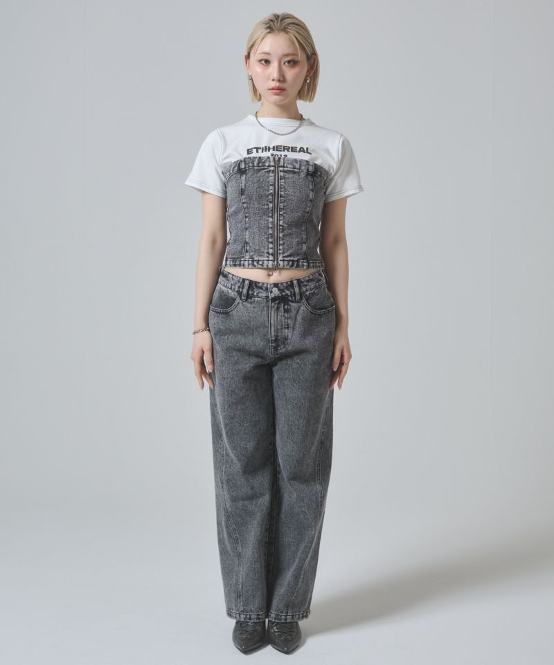 同色で作ったセンタージップデニムベアトップとセットアップでの着用もおすすめです。