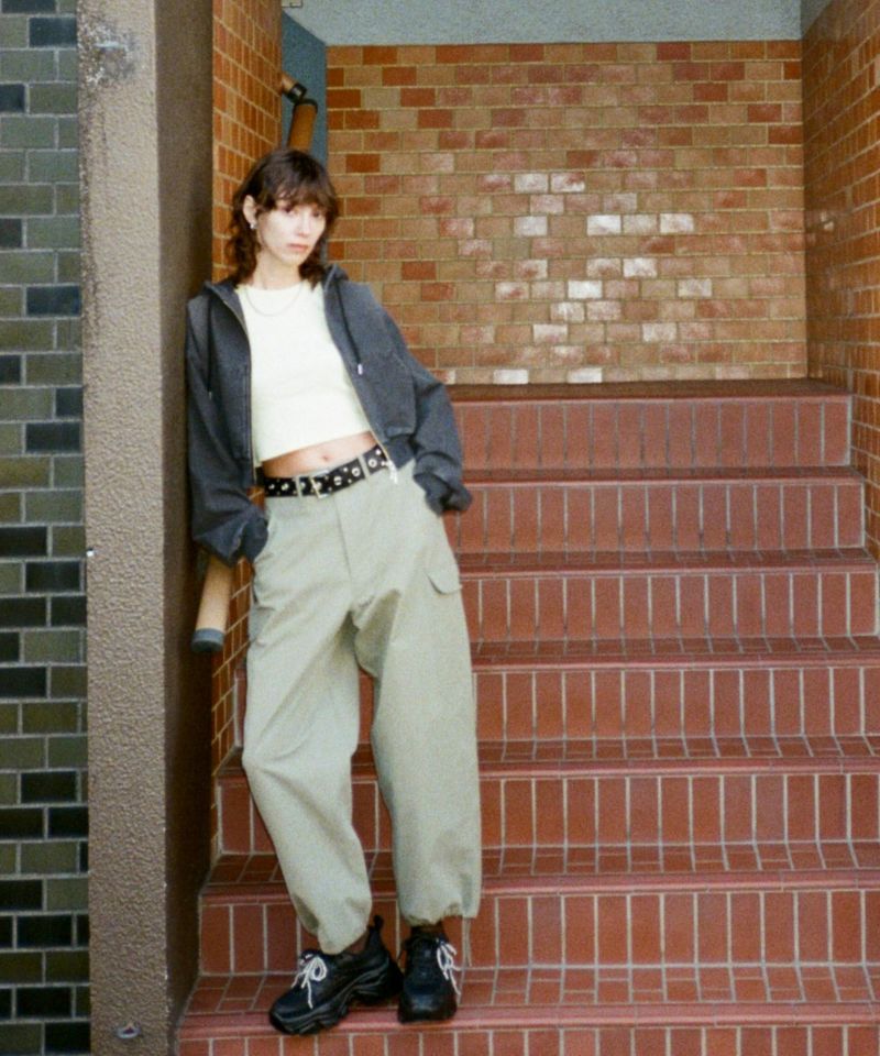 チビTやショート丈などを合わせて少し肌見せをするとバランスが良くなります。