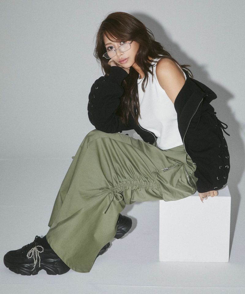 ローライズで着用してヘルシーにウエストを見せるスタイリングがおすすめです。