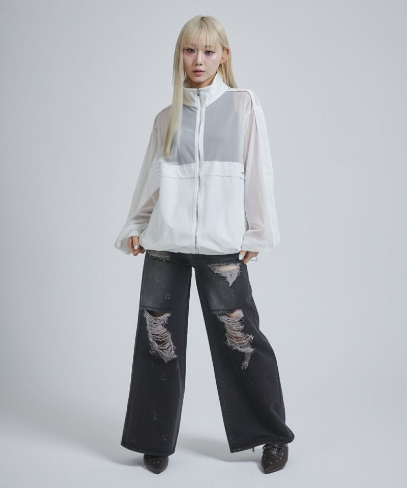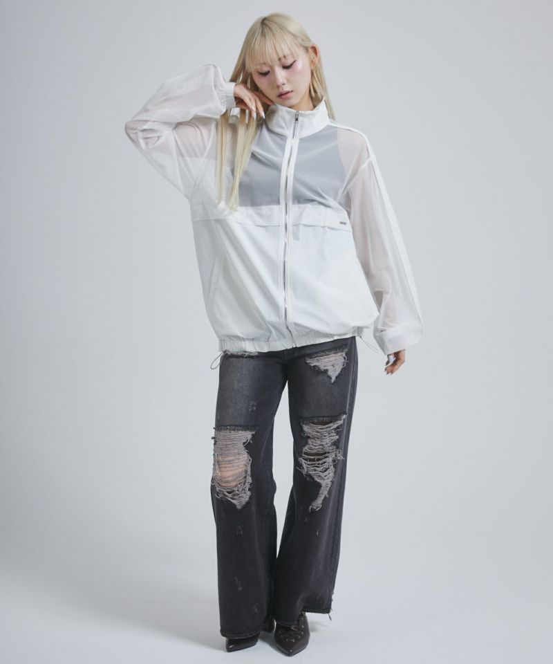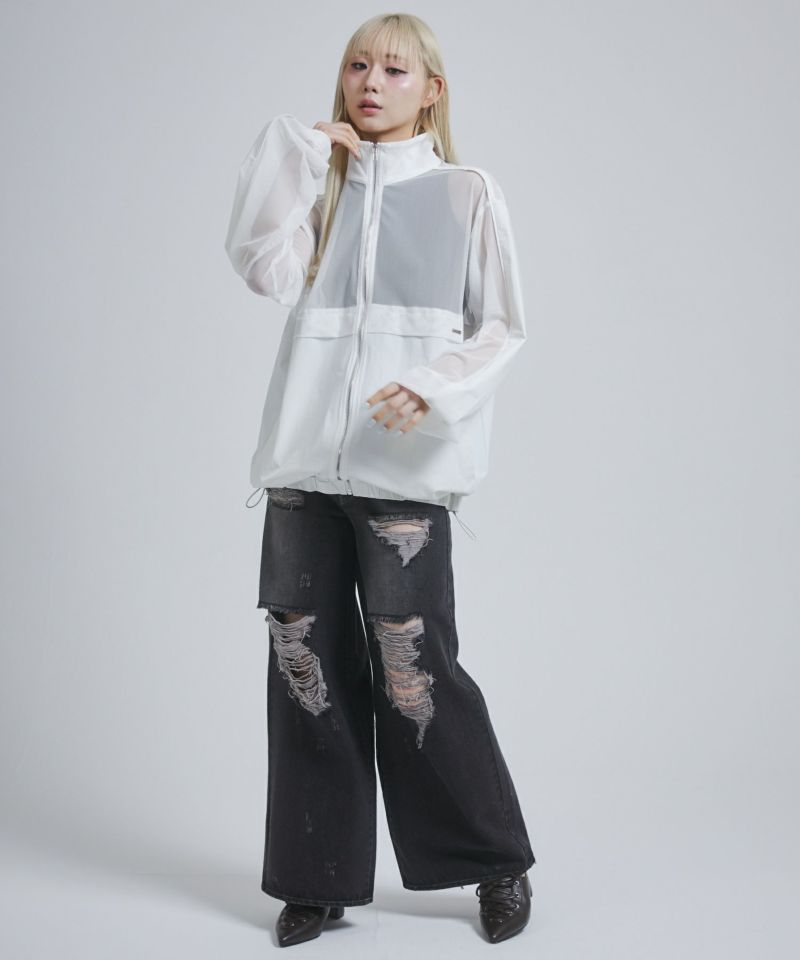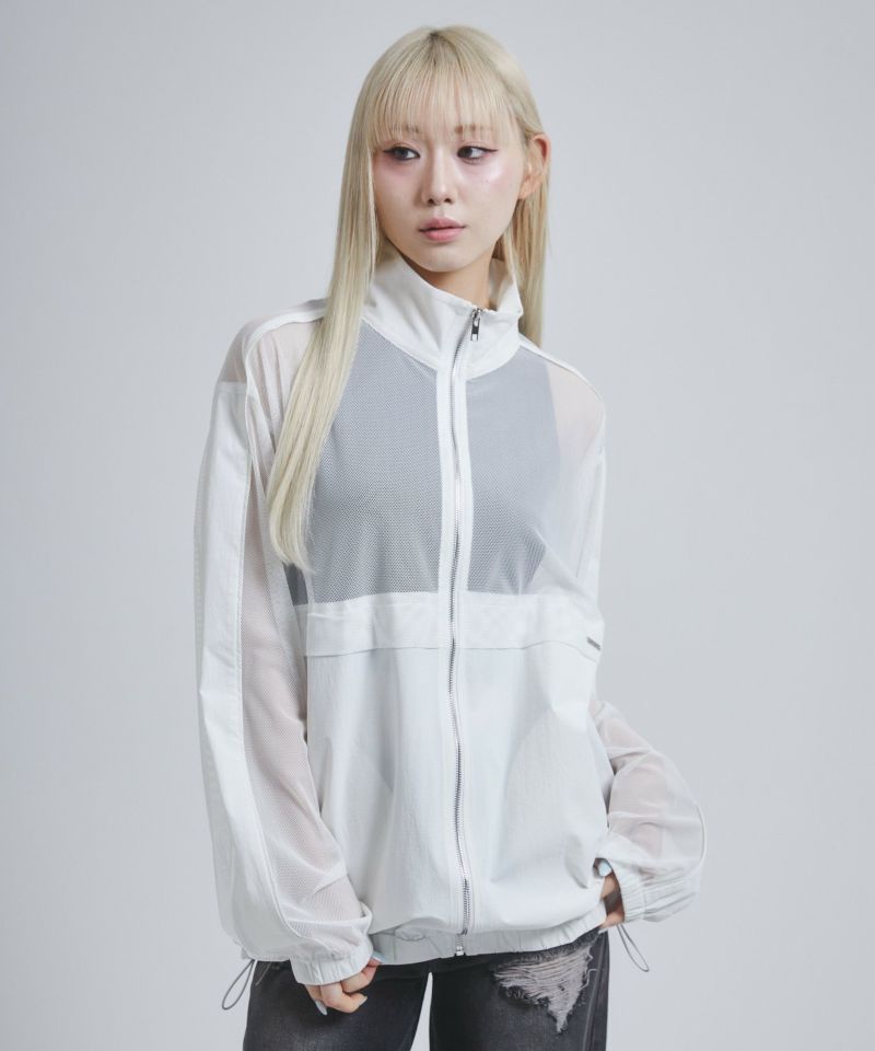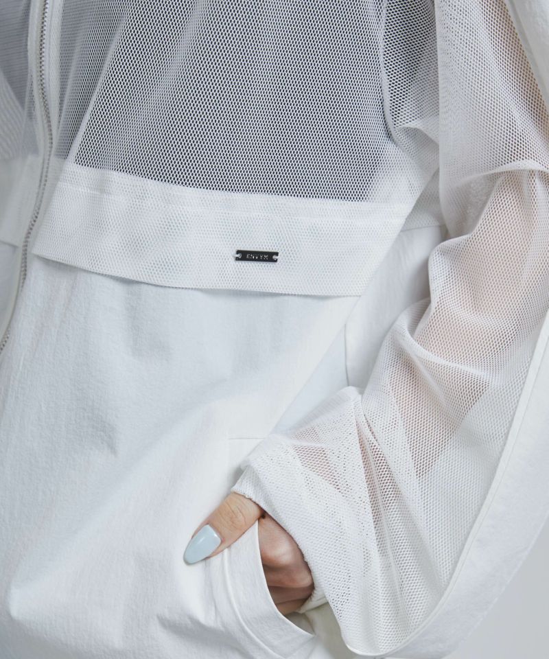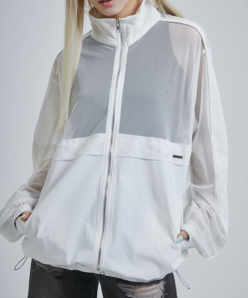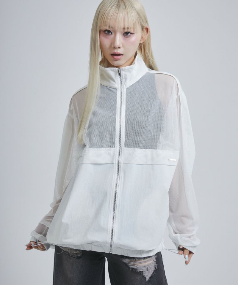 薄手のナイロン生地とメッシュ生地をドッキングさせたデザイン性が魅力のブルゾン。
