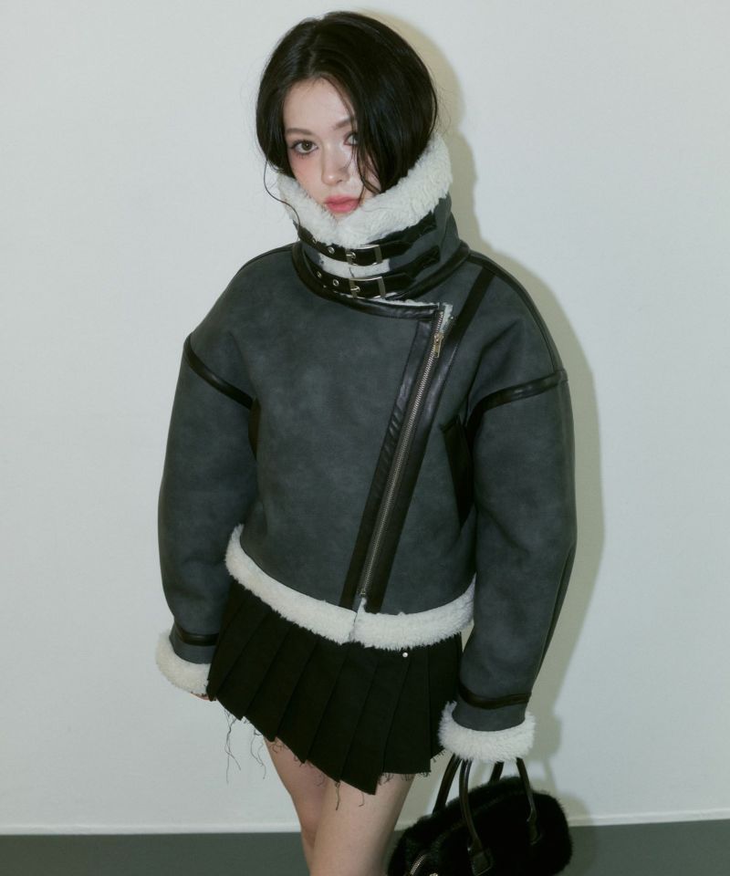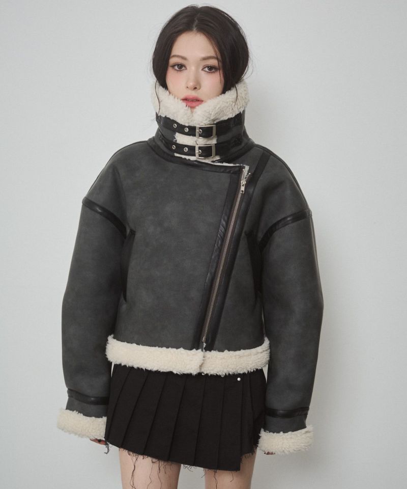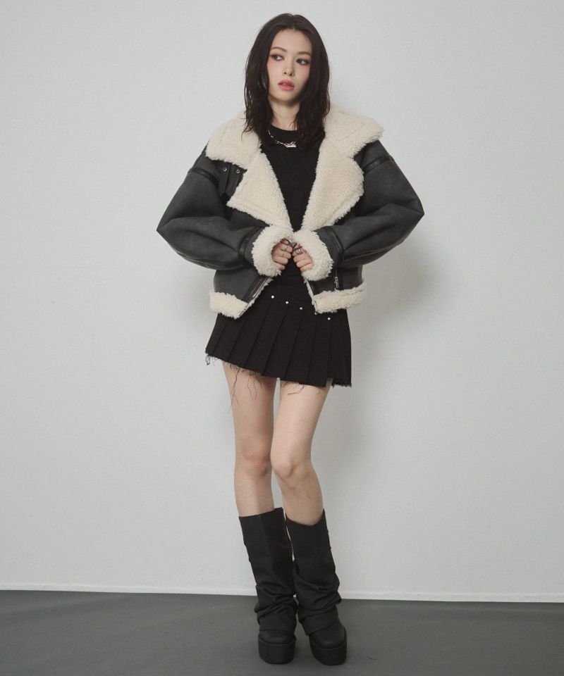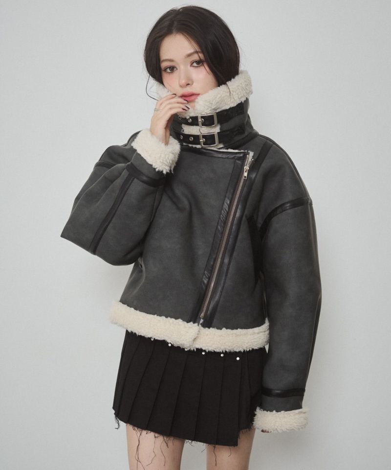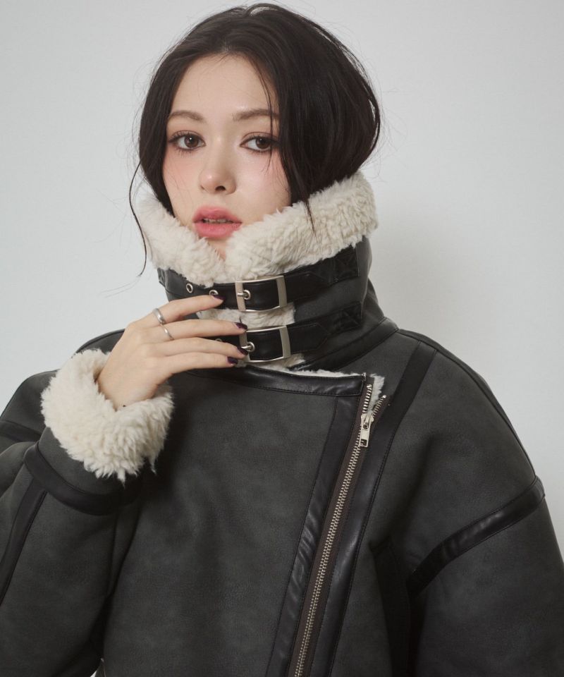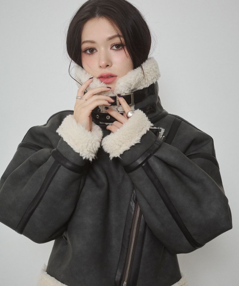 微配色のパイピングと立体感のあるボア生地が高級感のあるジャケット。