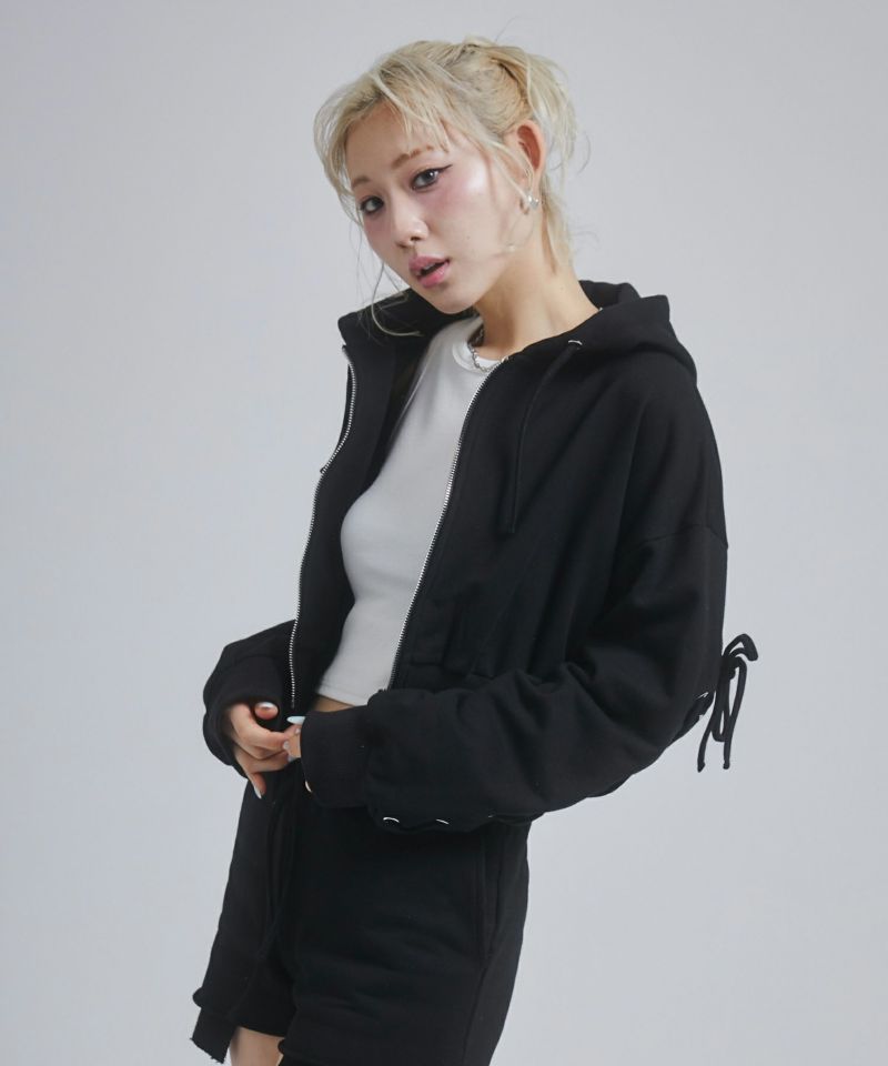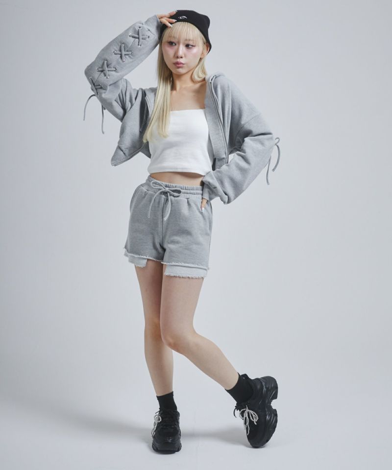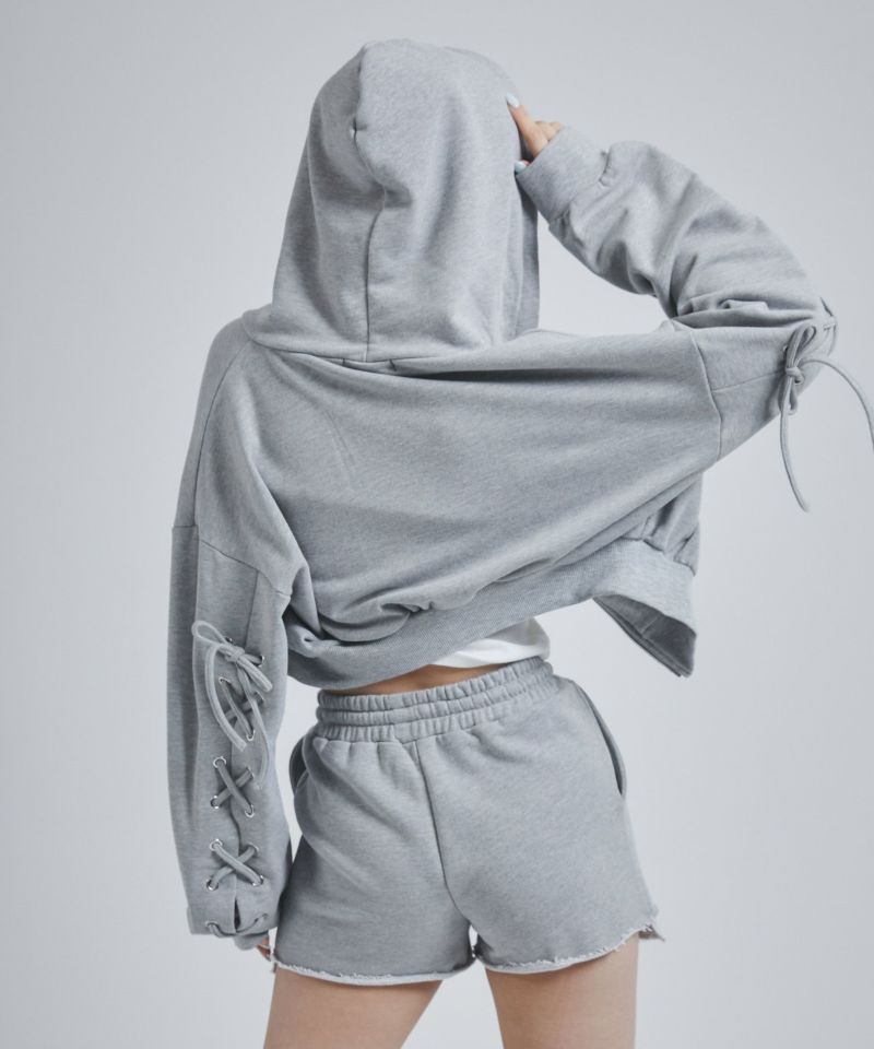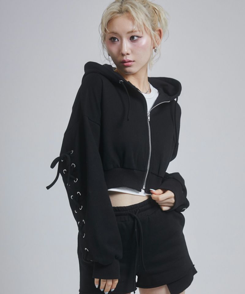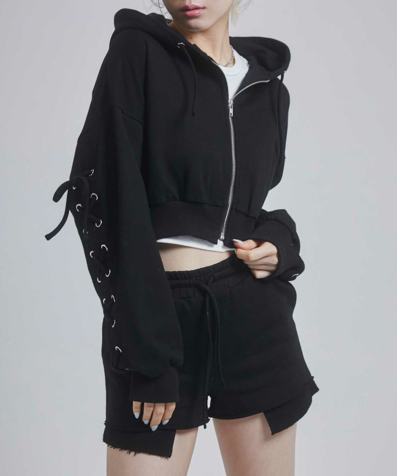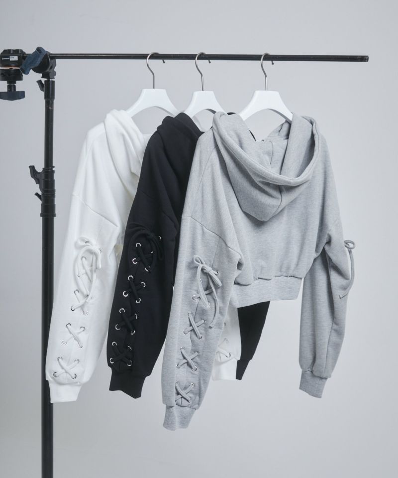 袖のレースアップデザインがデザイン性のあるショートパーカー。