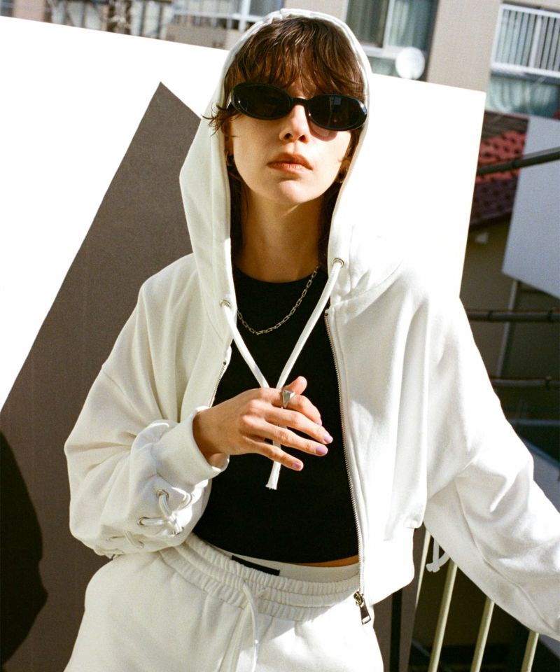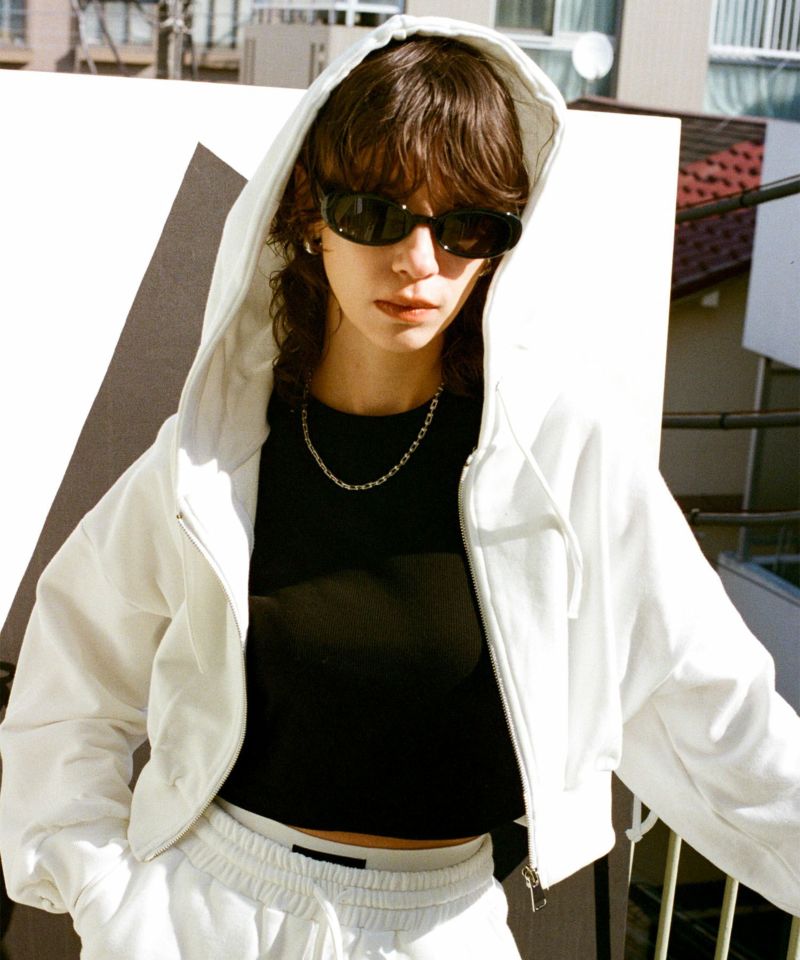 同素材のカットオフスウェットショートパンツと合わせてセットアップ風に着用するのもおすすめ!