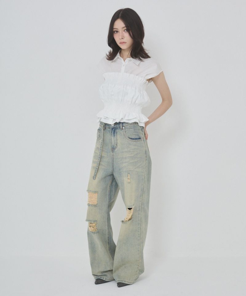 シャツの上にビスチェを重ねて着るレイヤードスタイルがこれ1着で出来ちゃいます。