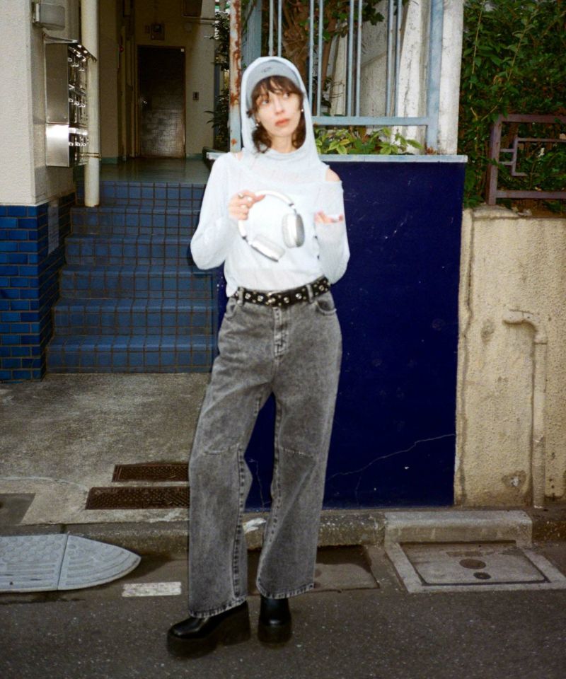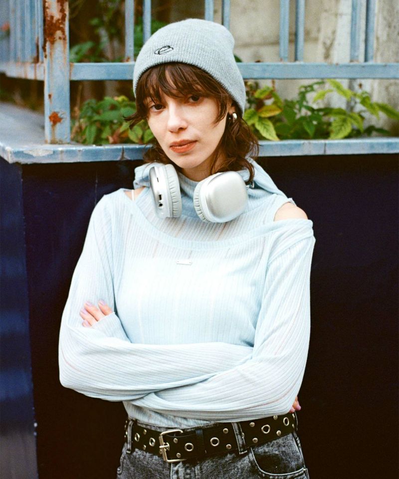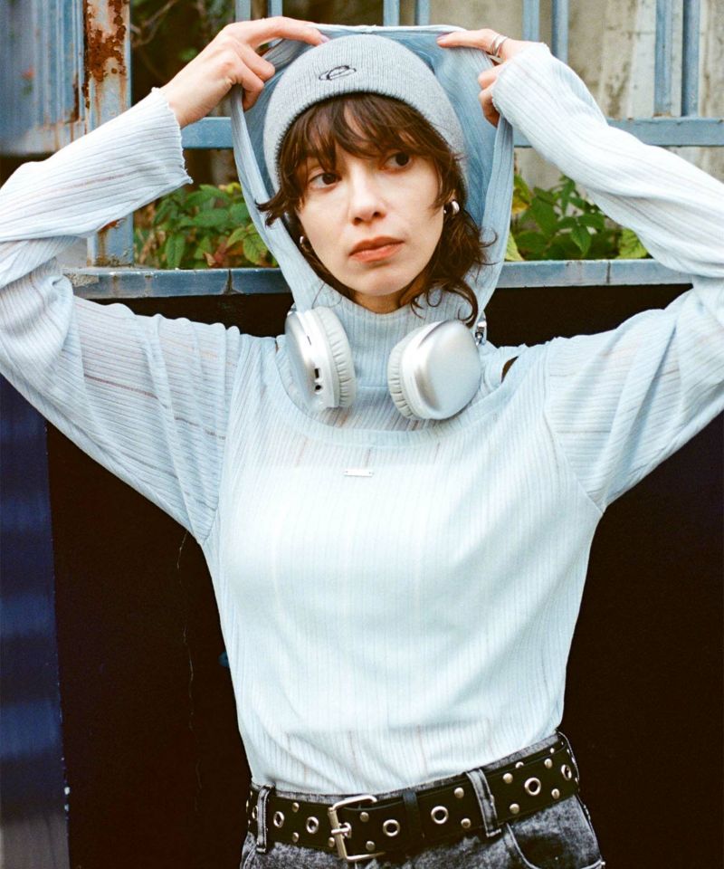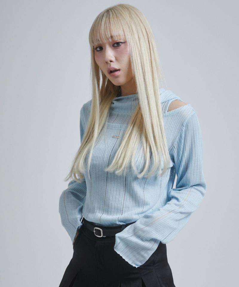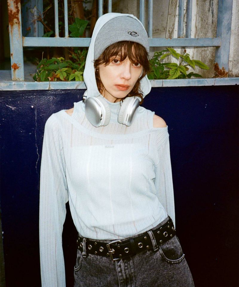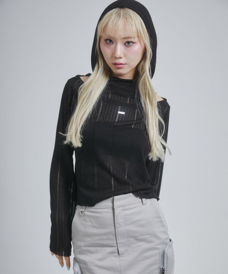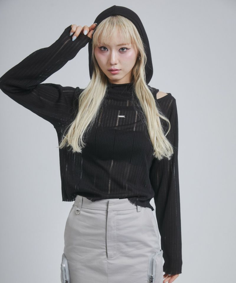 ハイネックのような首回りと、肩の肌見せがヘルシーで大人っぽい印象ですがフードが付いていることでカジュアル感をプラスしています。