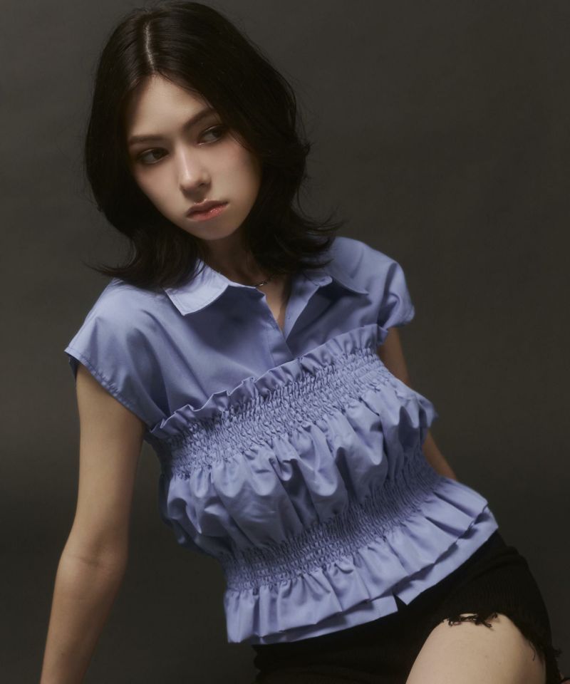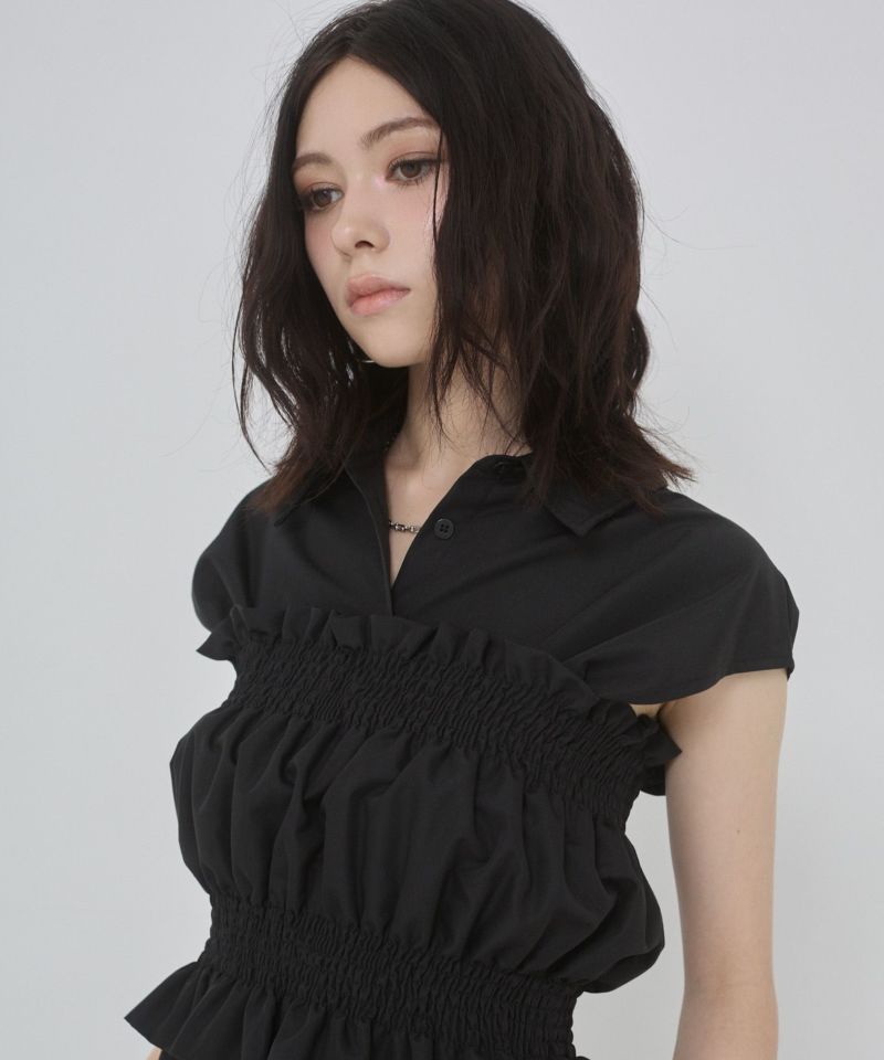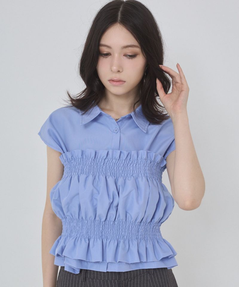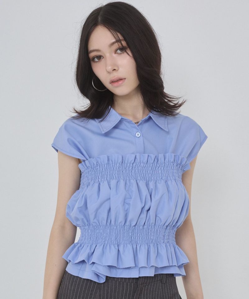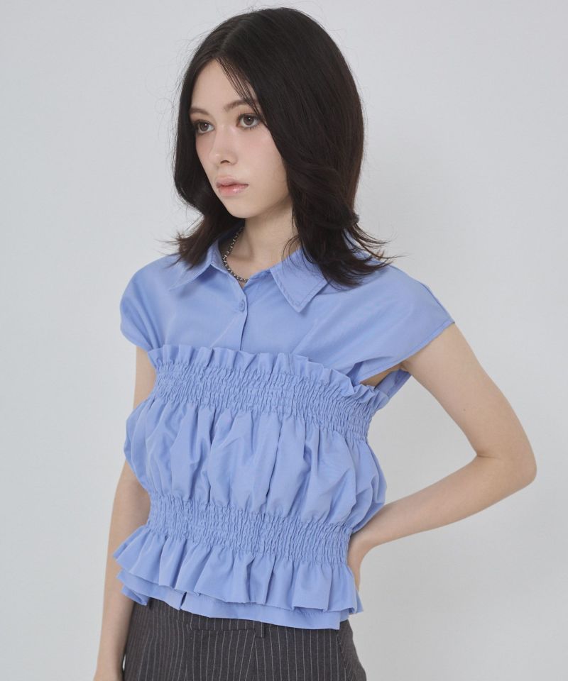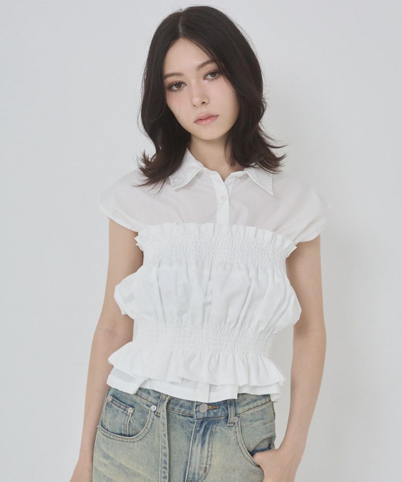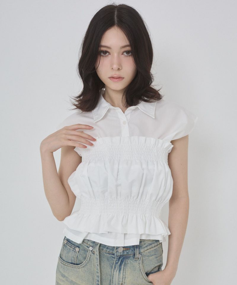 シャツの上にビスチェを重ねて着るレイヤードスタイルがこれ1着で出来ちゃいます。