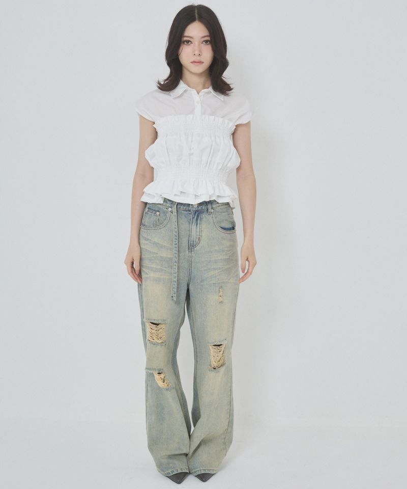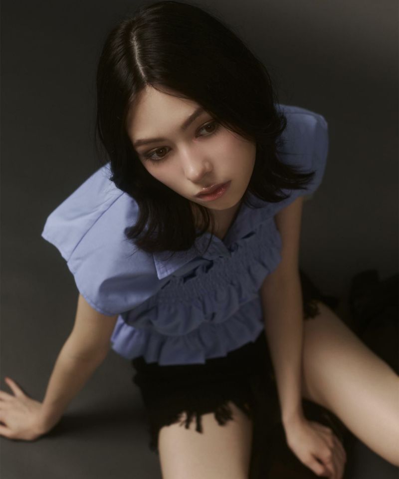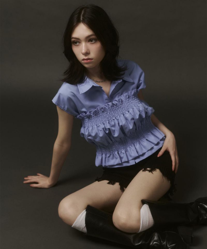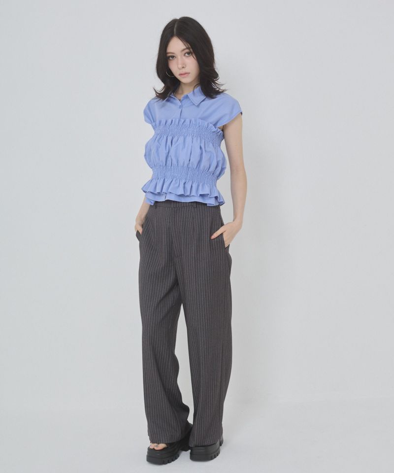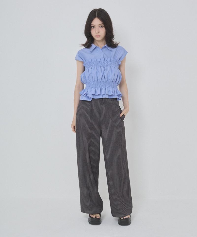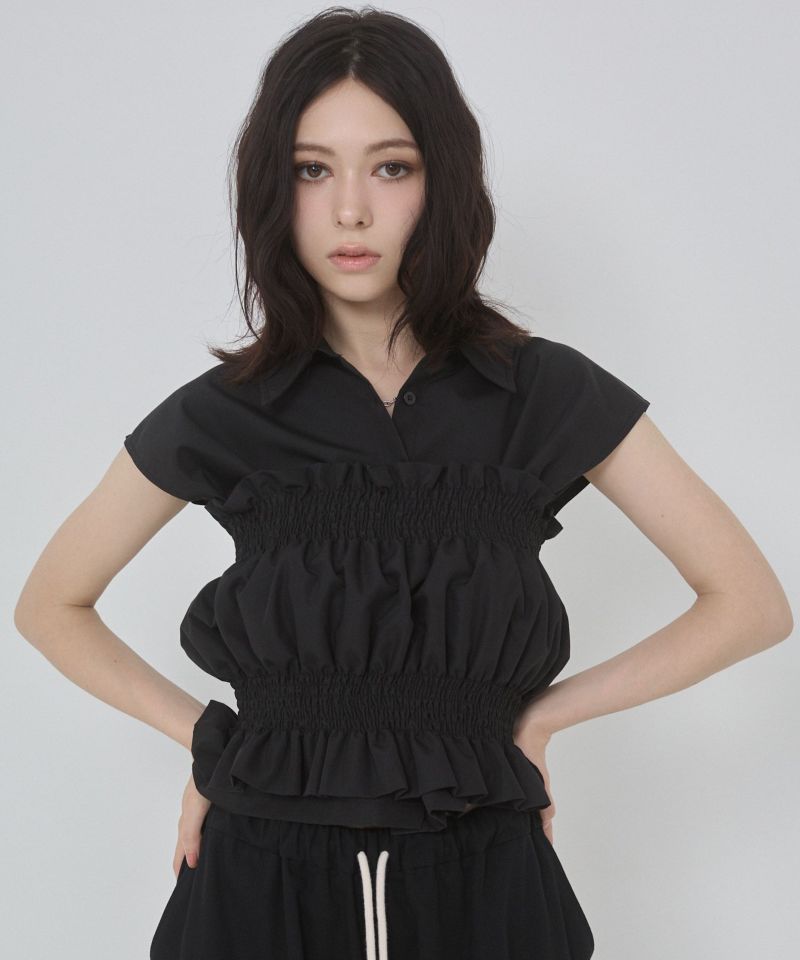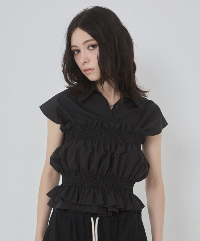 シャツの上にビスチェを重ねて着るレイヤードスタイルがこれ1着で出来ちゃいます。