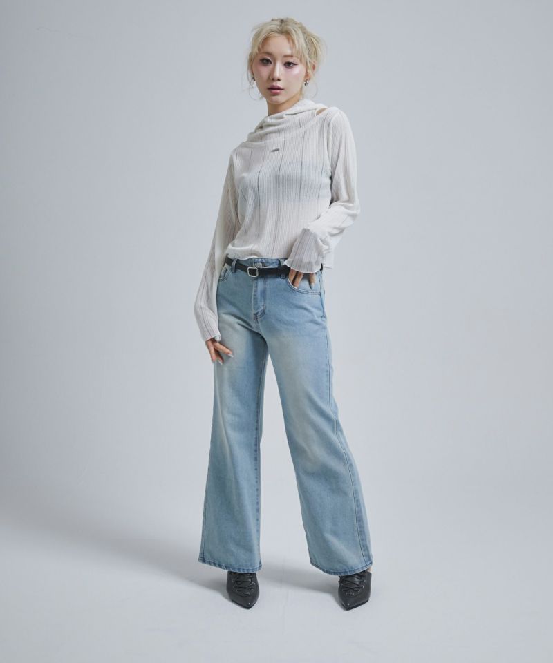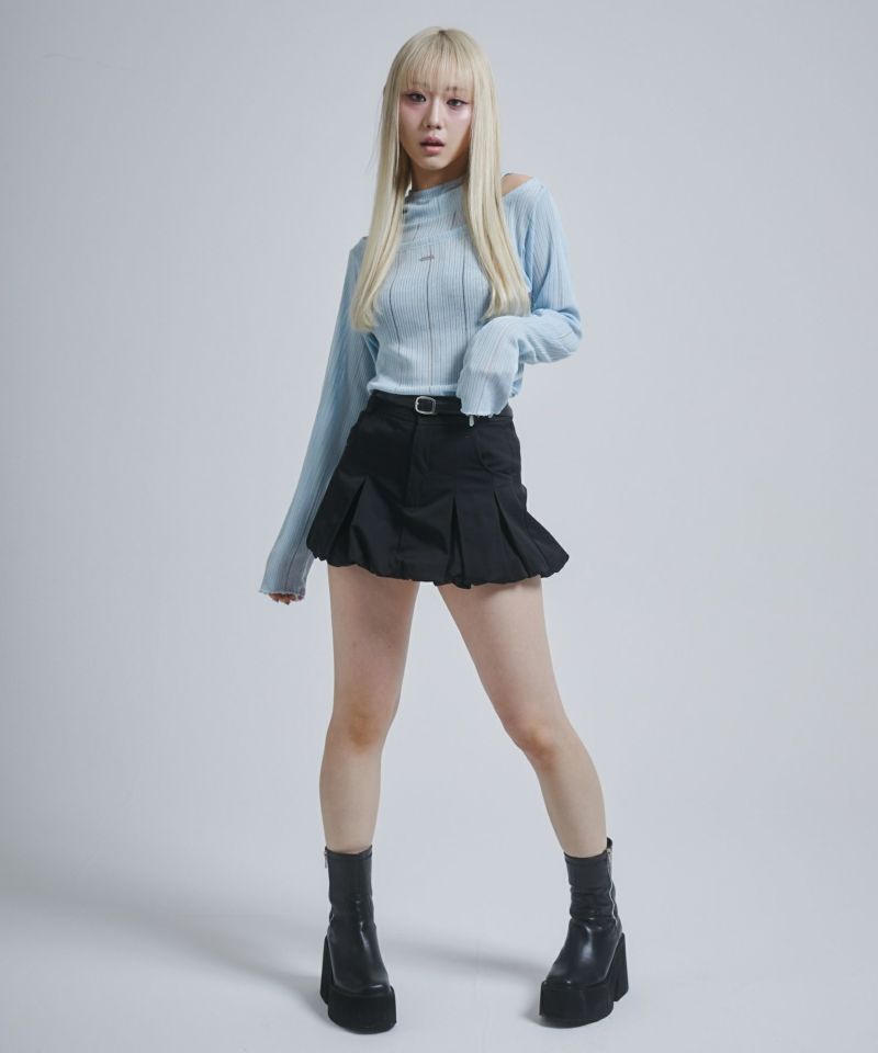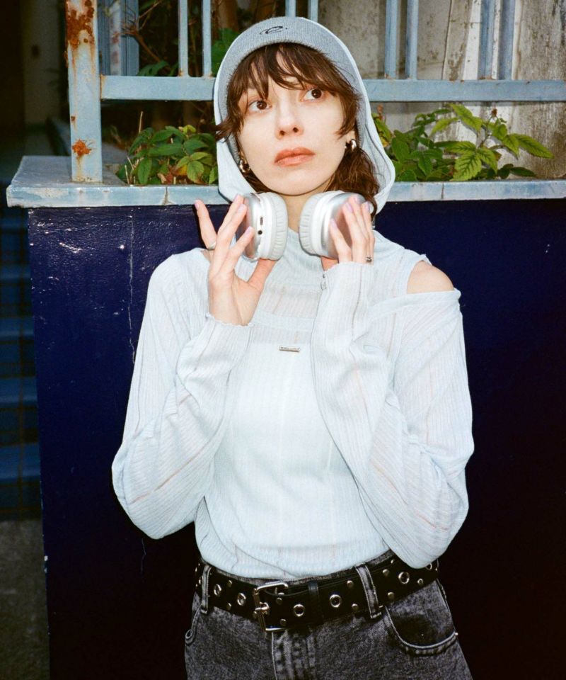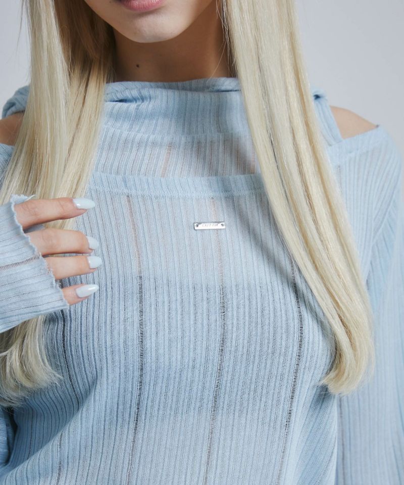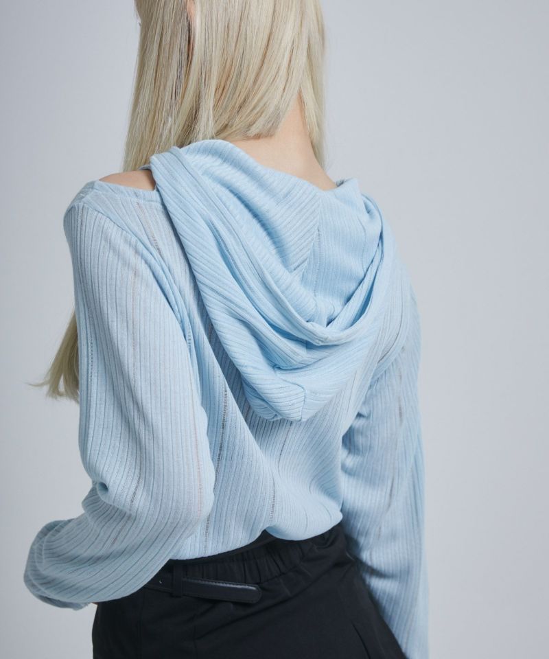 ハイネックのような首回りと、肩の肌見せがヘルシーで大人っぽい印象ですがフードが付いていることでカジュアル感をプラスしています。