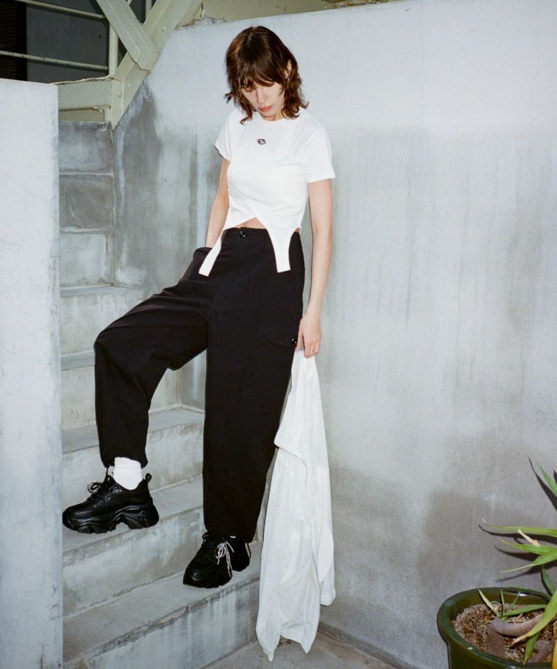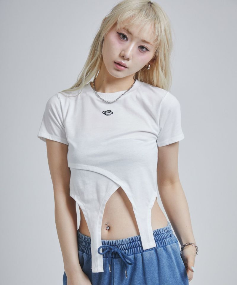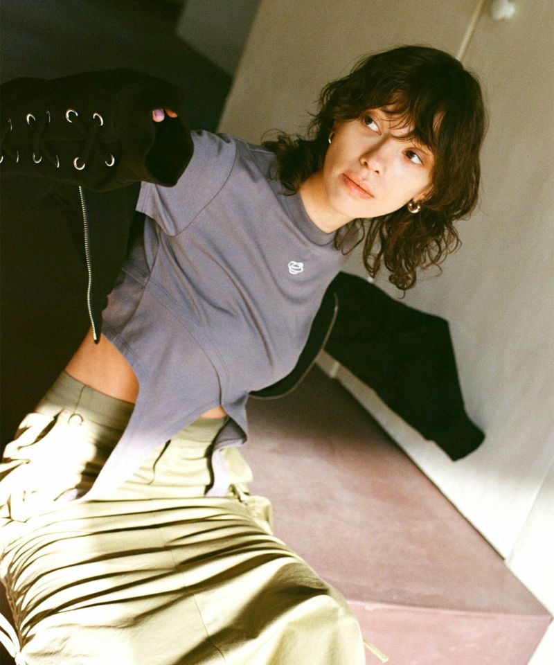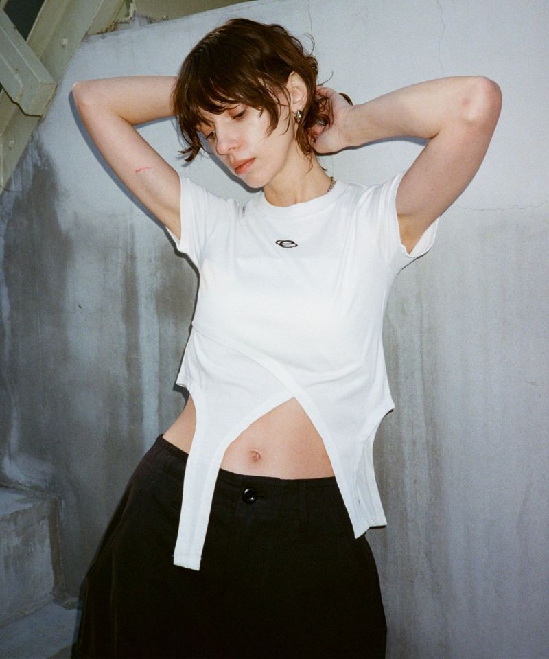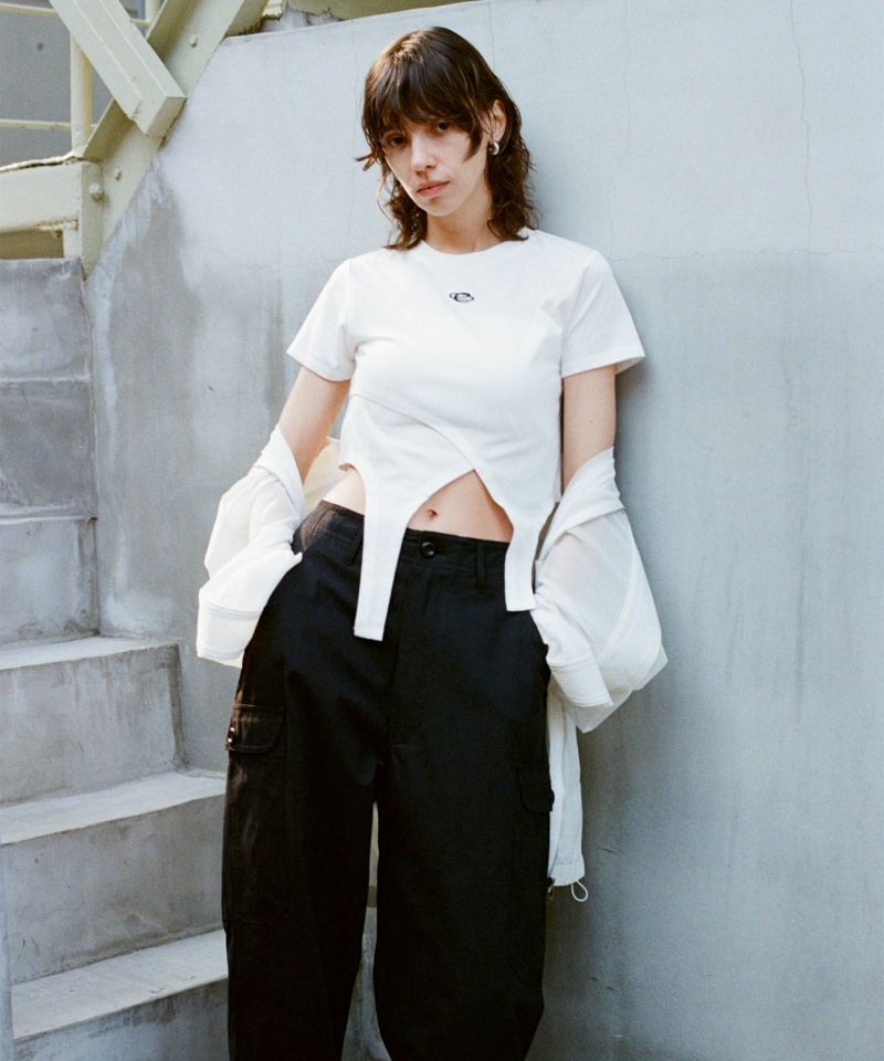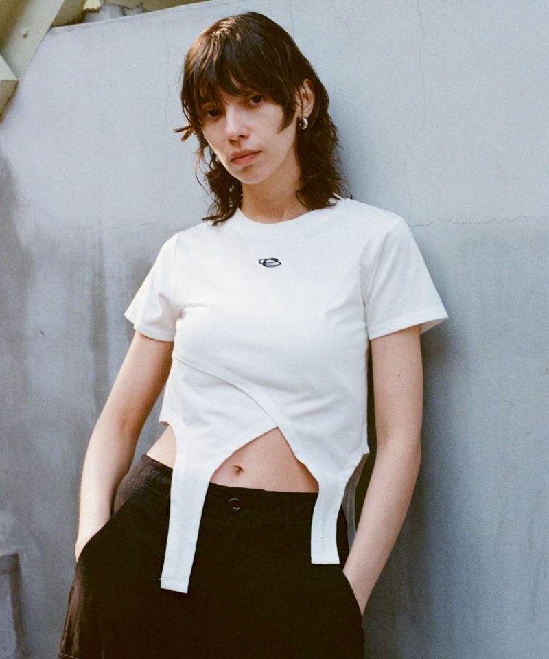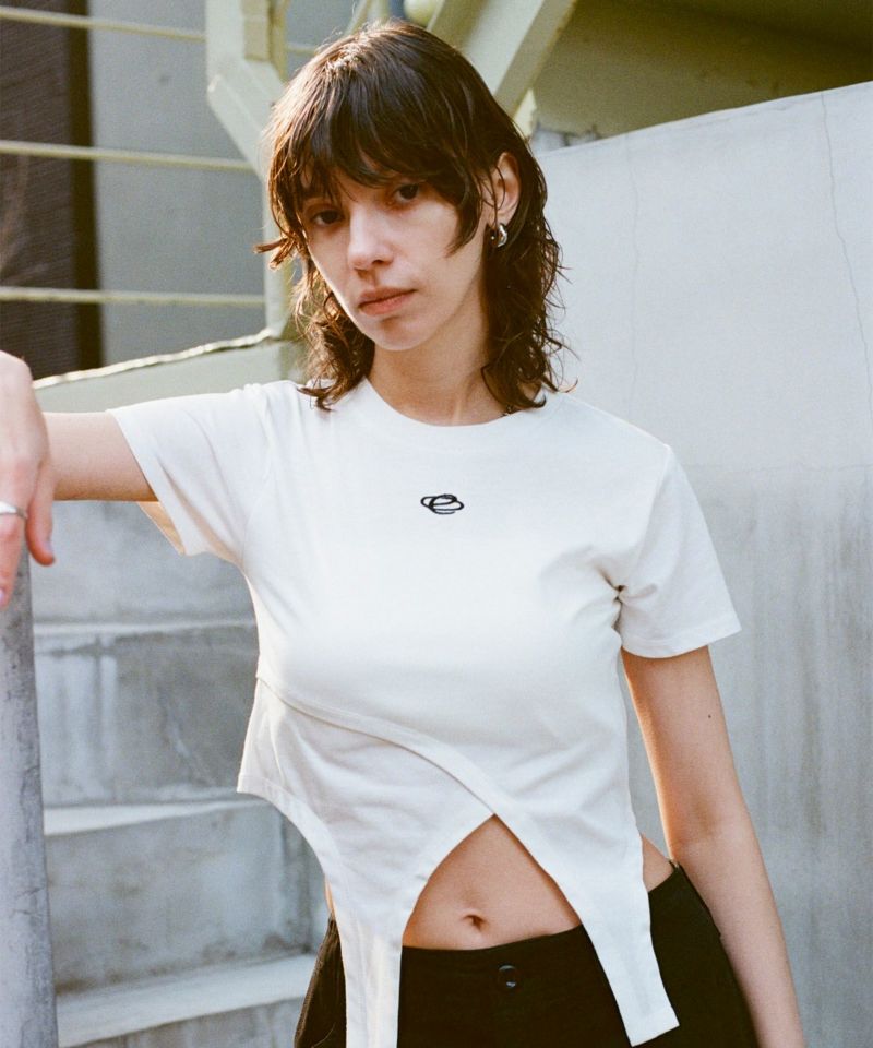 -------------------------------------------------- ■ポイント 裾のデザイン性がポイントのコンパクトTシャツ! ■ディティール Tシャツを2枚重ねてきているようなデティールが一癖ありポイントなTシャツ。 裾は変形にして他にはないアイテムに。 フロントにはオリジナルワンポイントを刺繍しています。 ■スタイリング ショート丈なので、肌みせを控えたい方はハイウエストボトムと合わせるのが◎ アウターのインナー使いにもおすすめです。 --------------------------------------------------