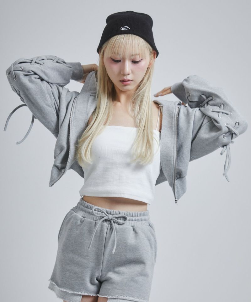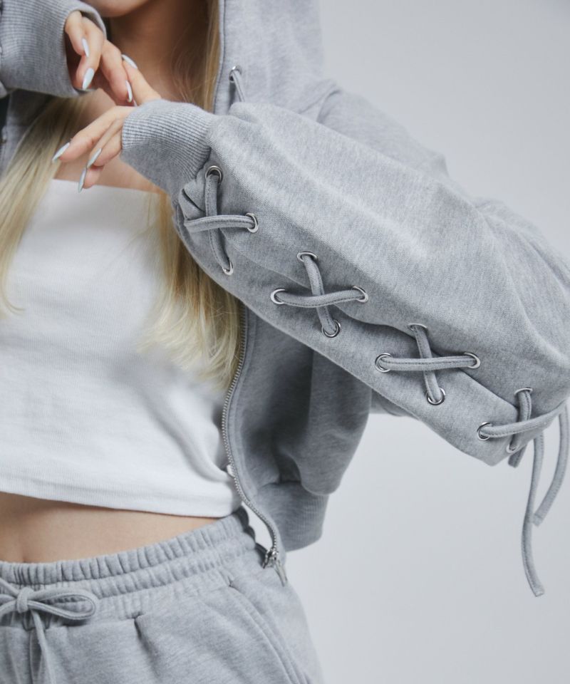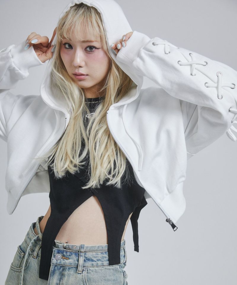 袖のレースアップデザインがデザイン性のあるショートパーカー。