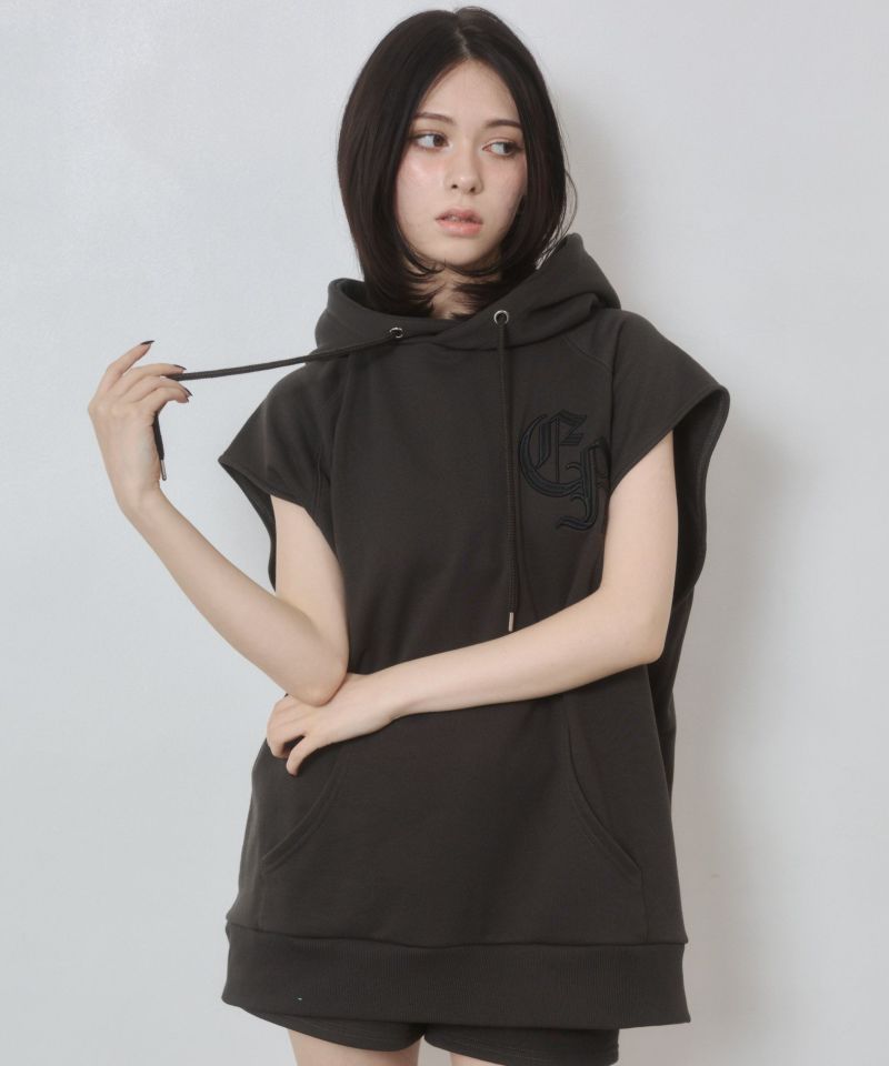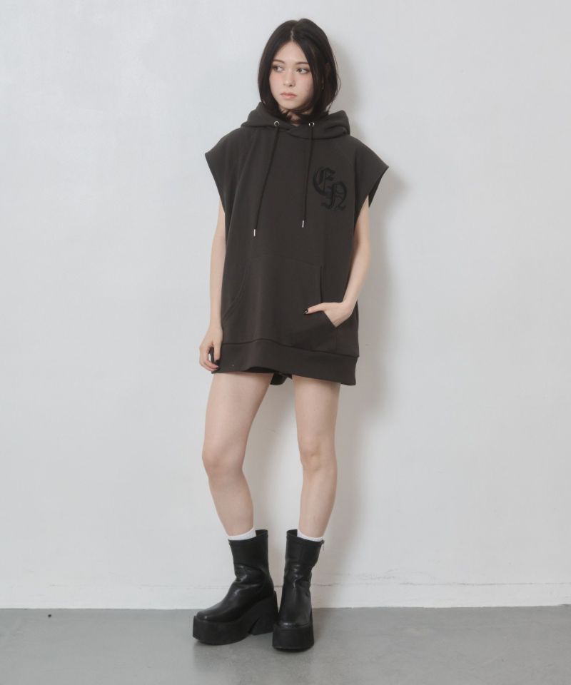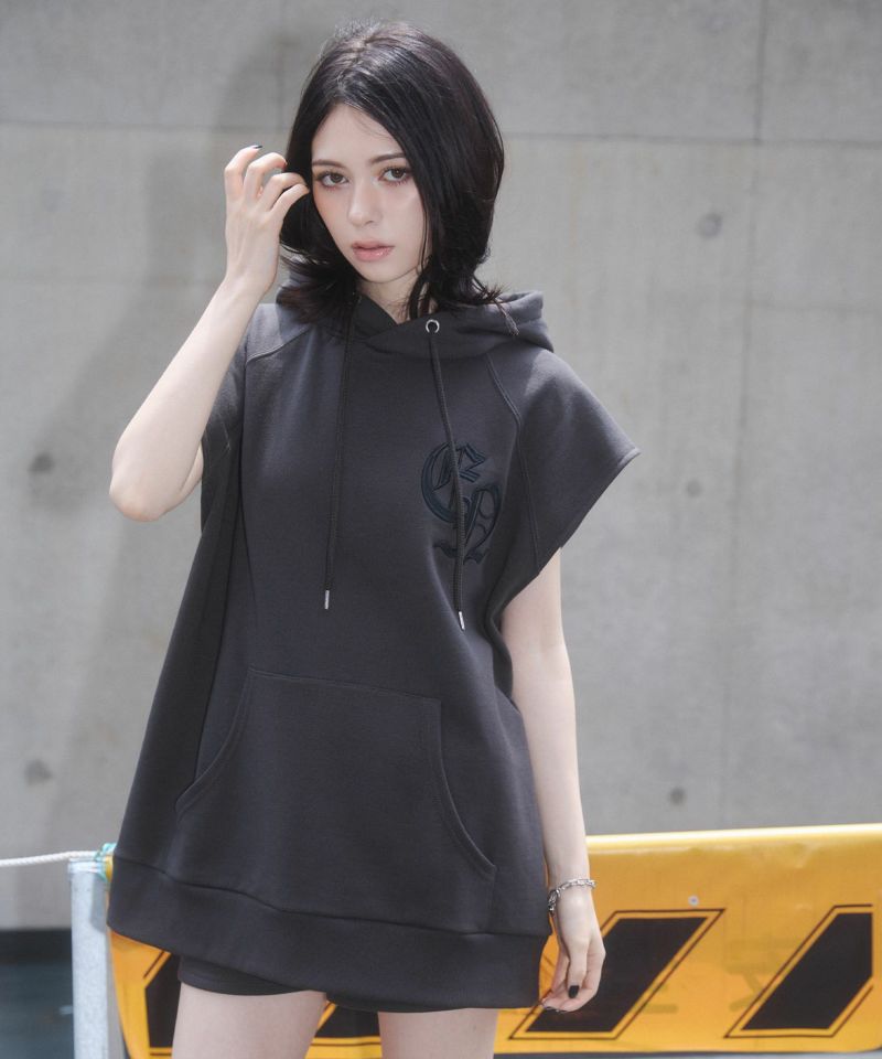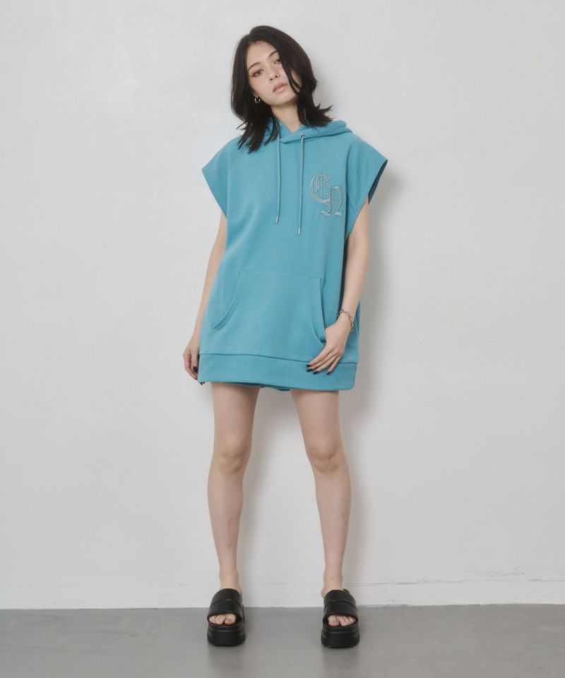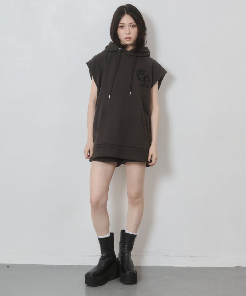 同素材を使用したワンポイントスウェットショートパンツとセットアップで着用するのがおすすめ。