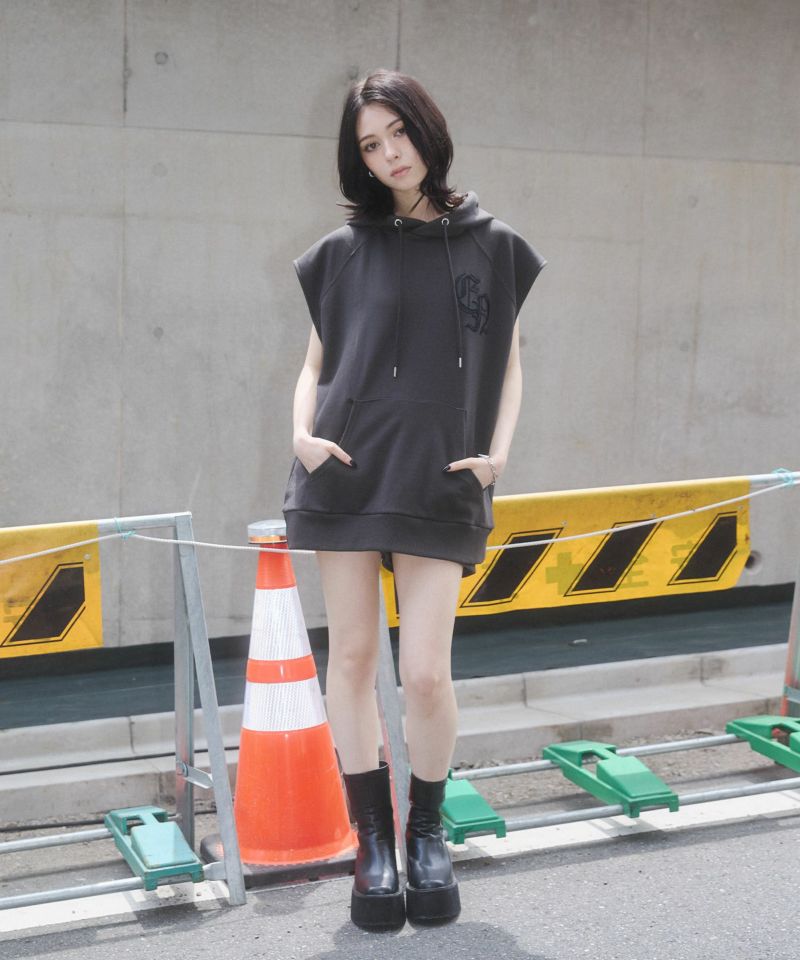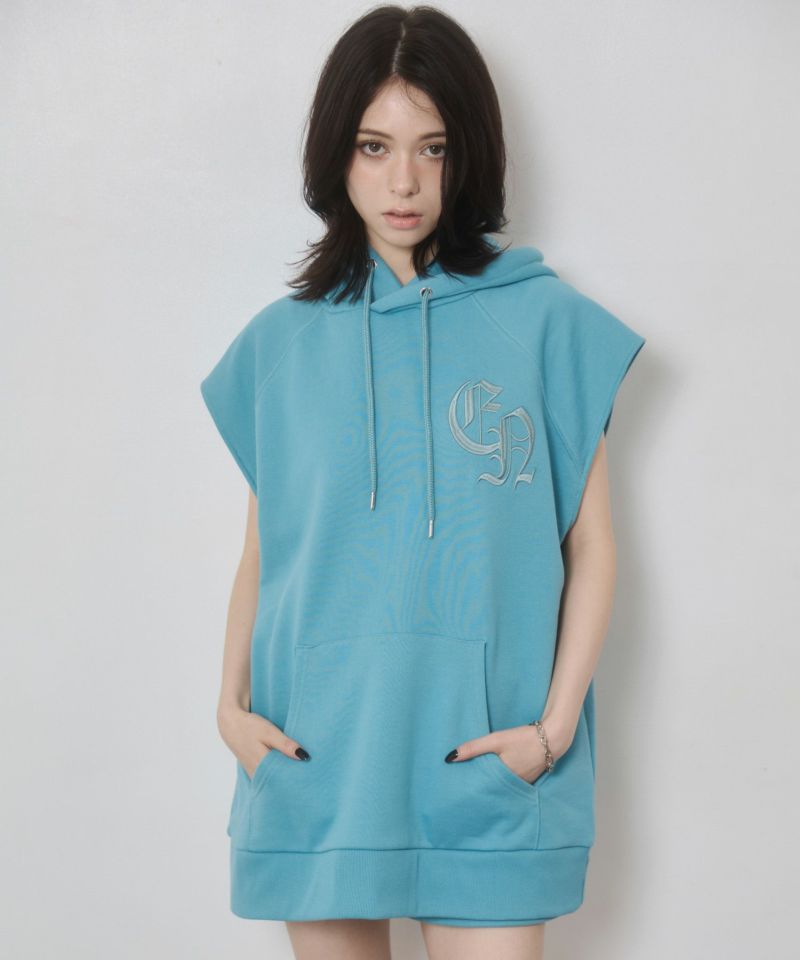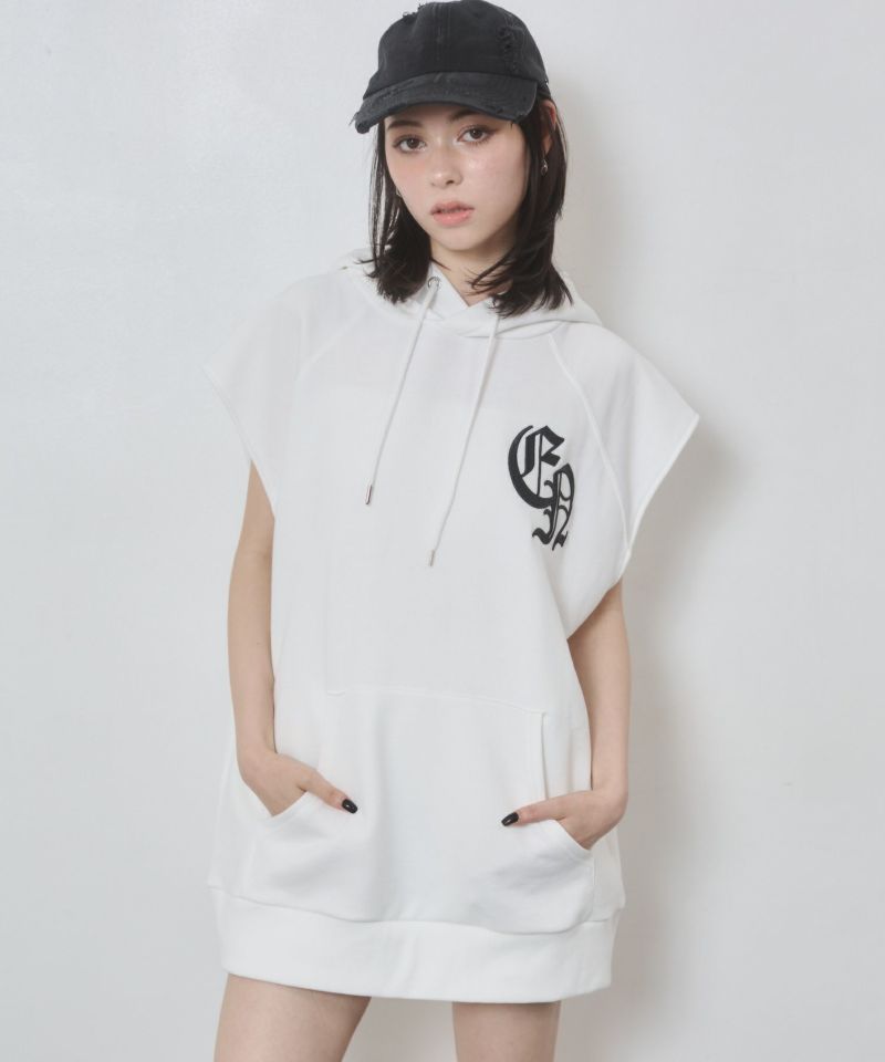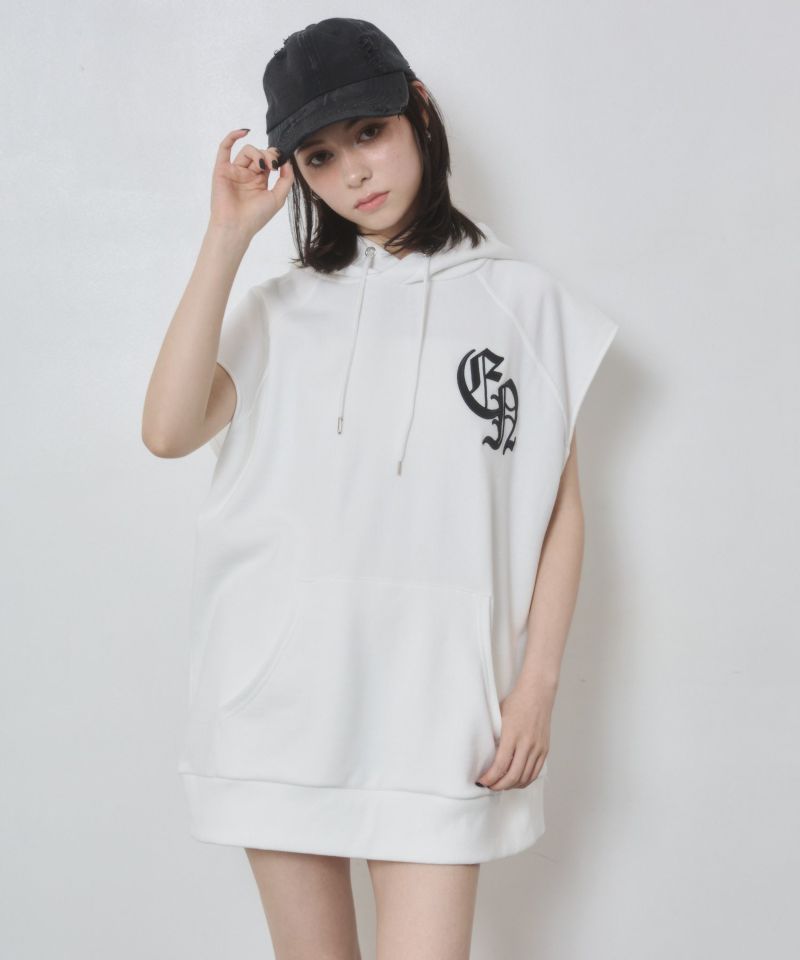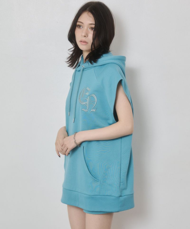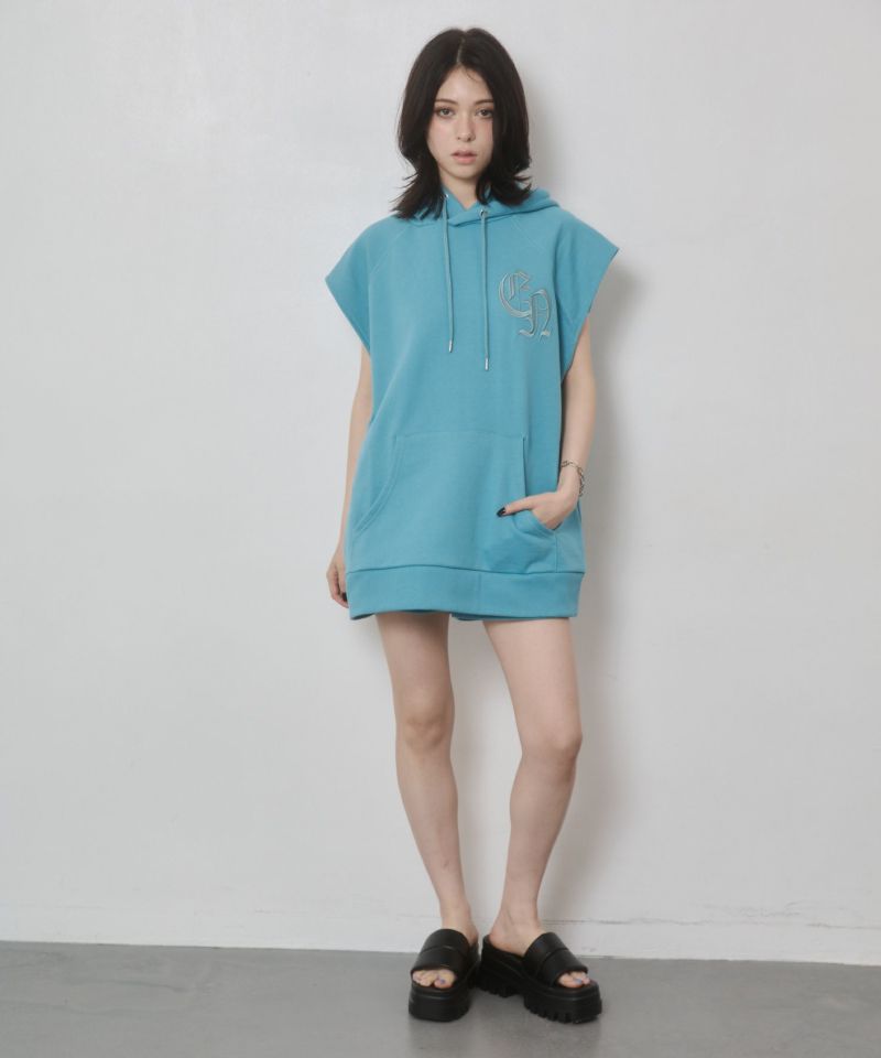 同素材を使用したワンポイントスウェットショートパンツとセットアップで着用するのがおすすめ。