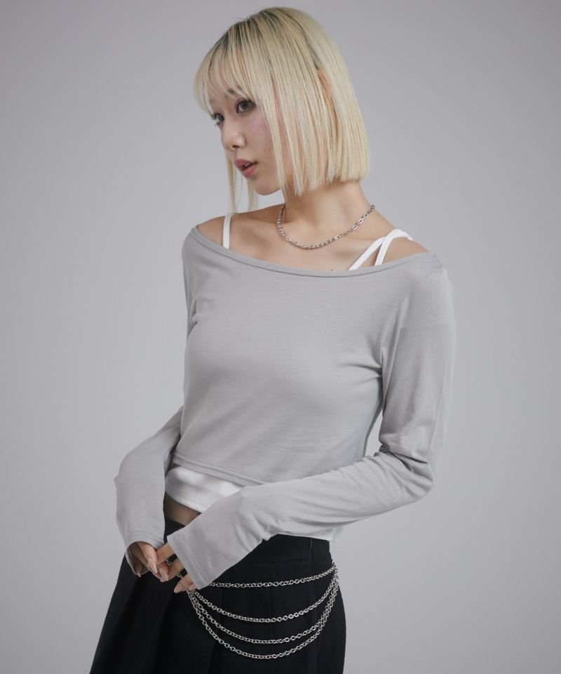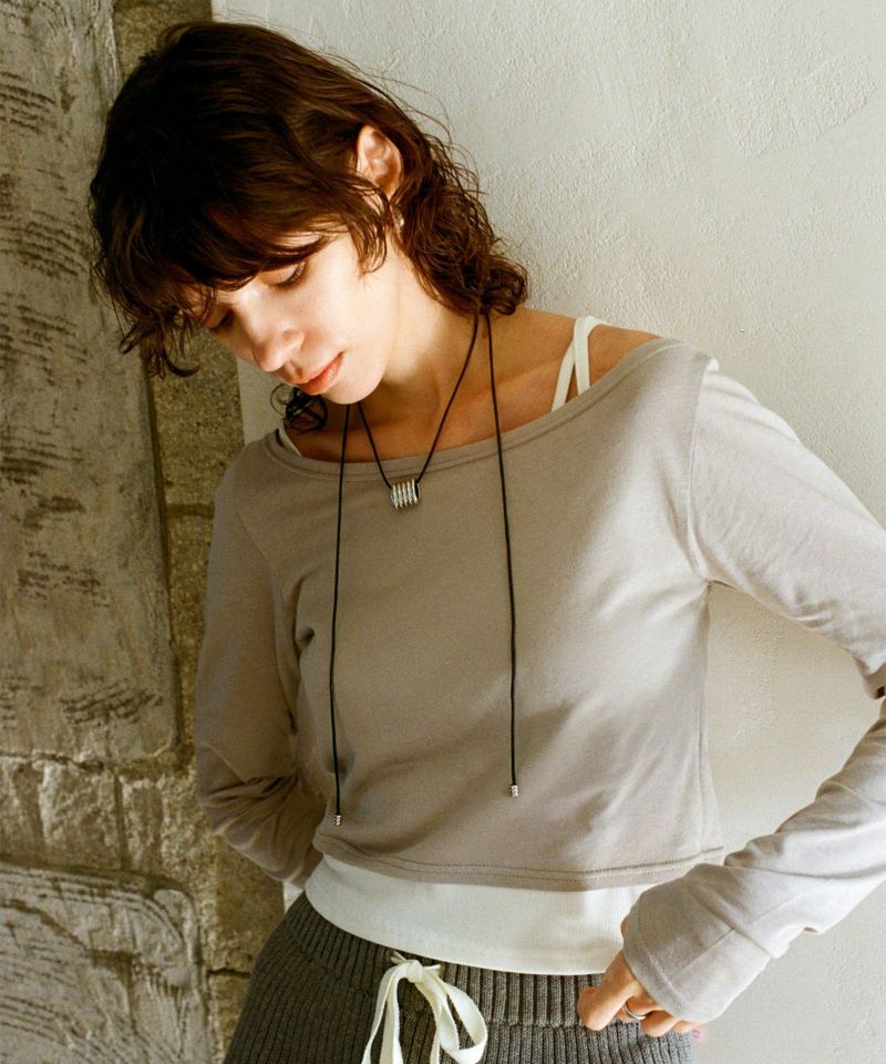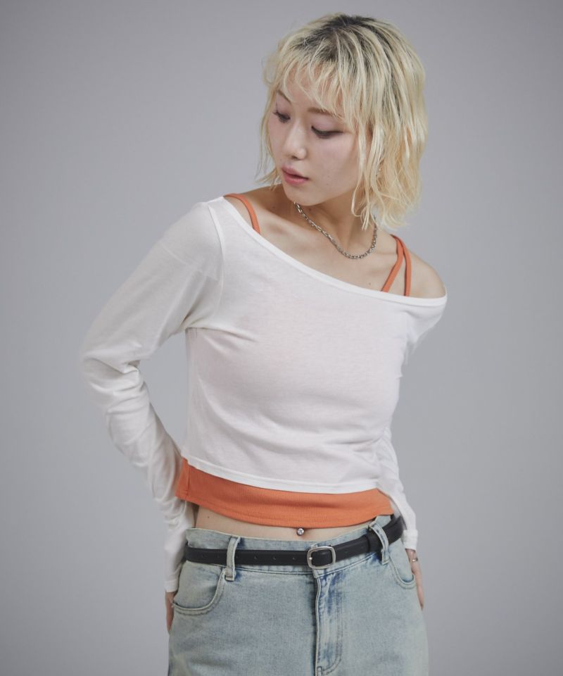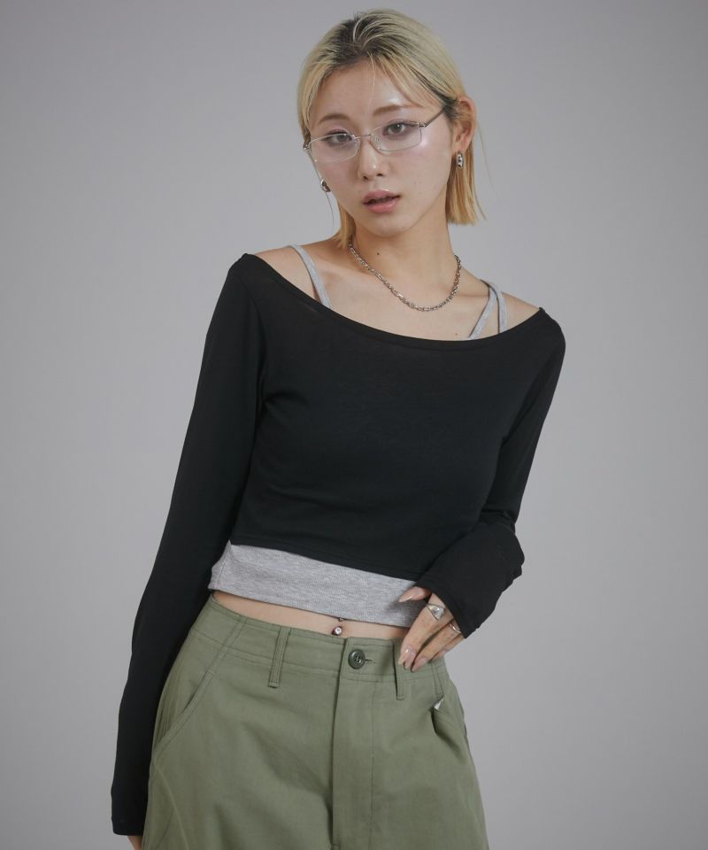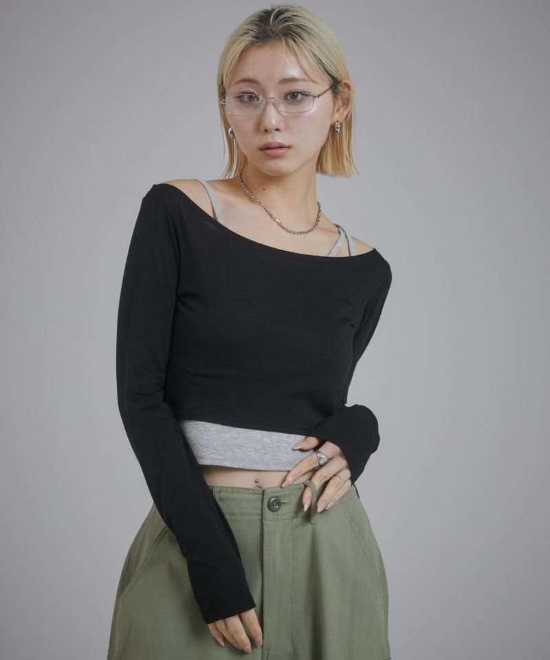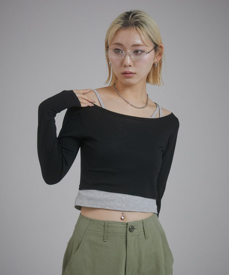 キャミソール部分はカットリブ、ロンT部分はシアー感のあるカットソーを使用しています。