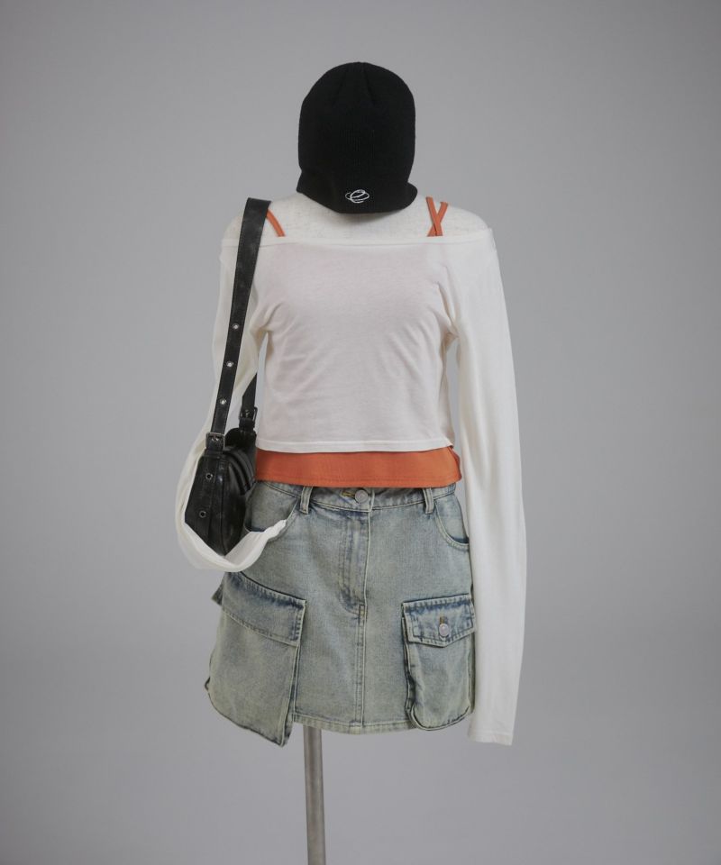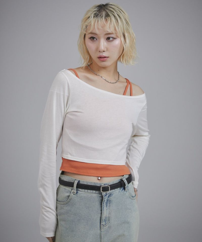 キャミソールとロンTを脇で縫い付けたレイヤードトップス。