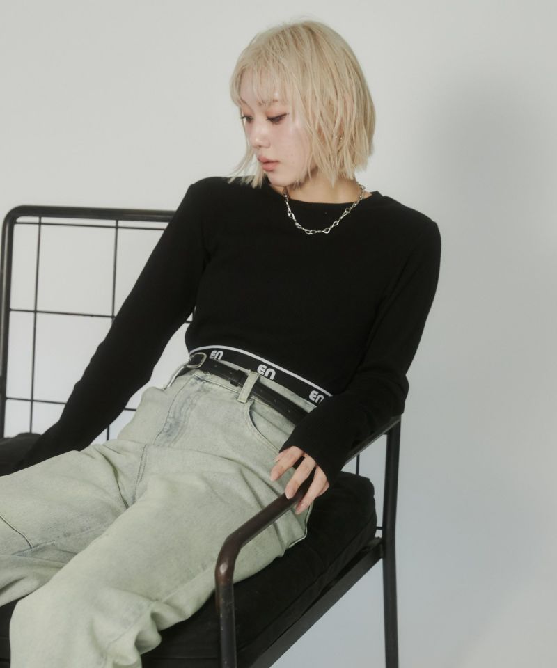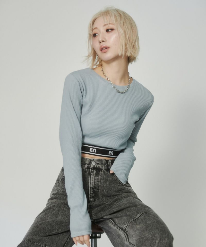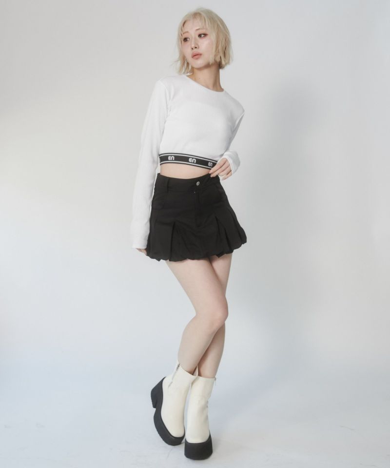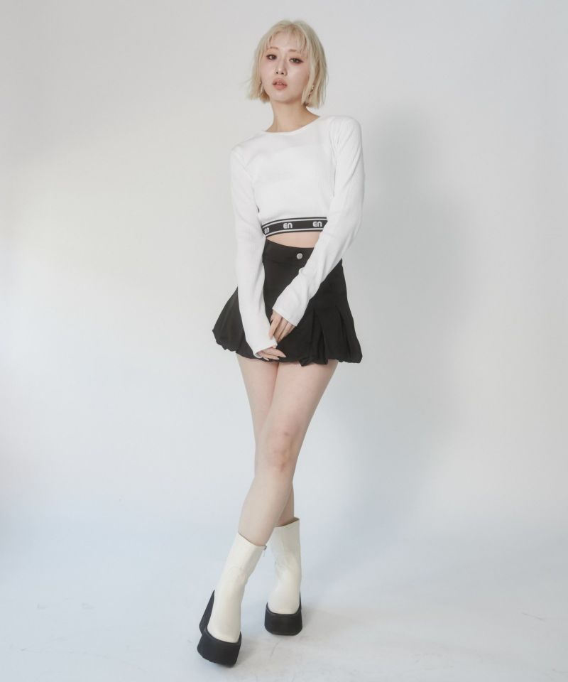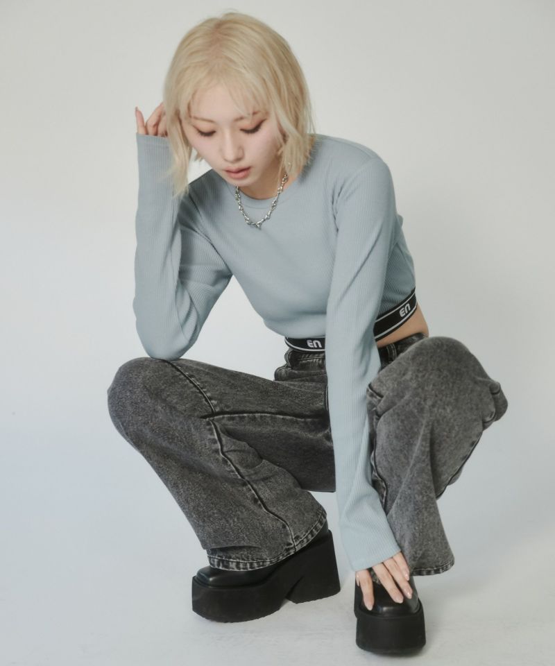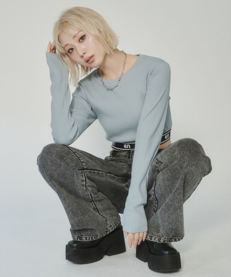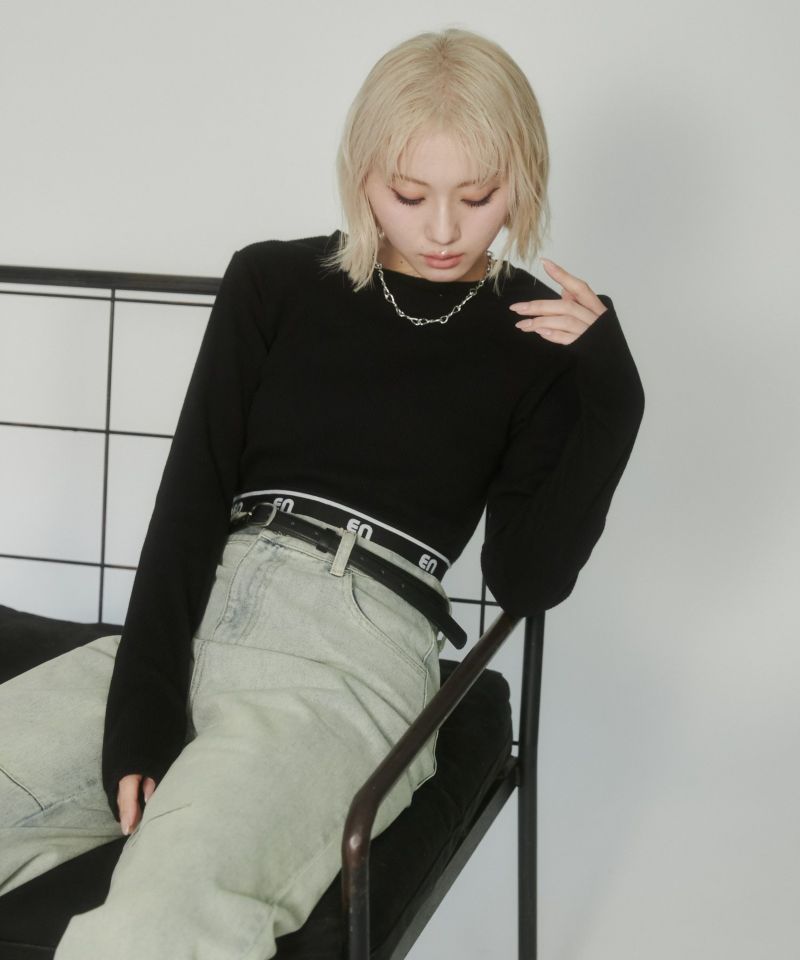 ショート丈なのでハイウエストボトムで合わせるとバランスよく着こなせます。
