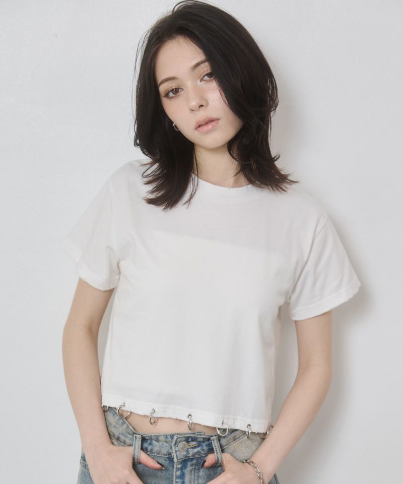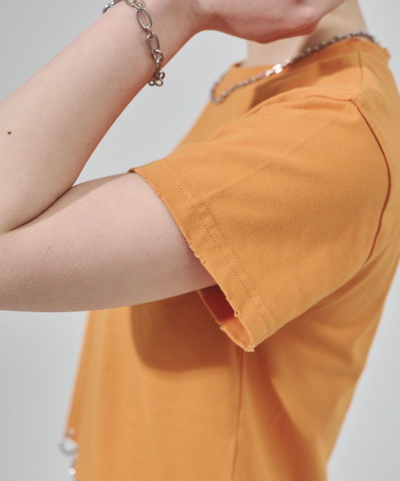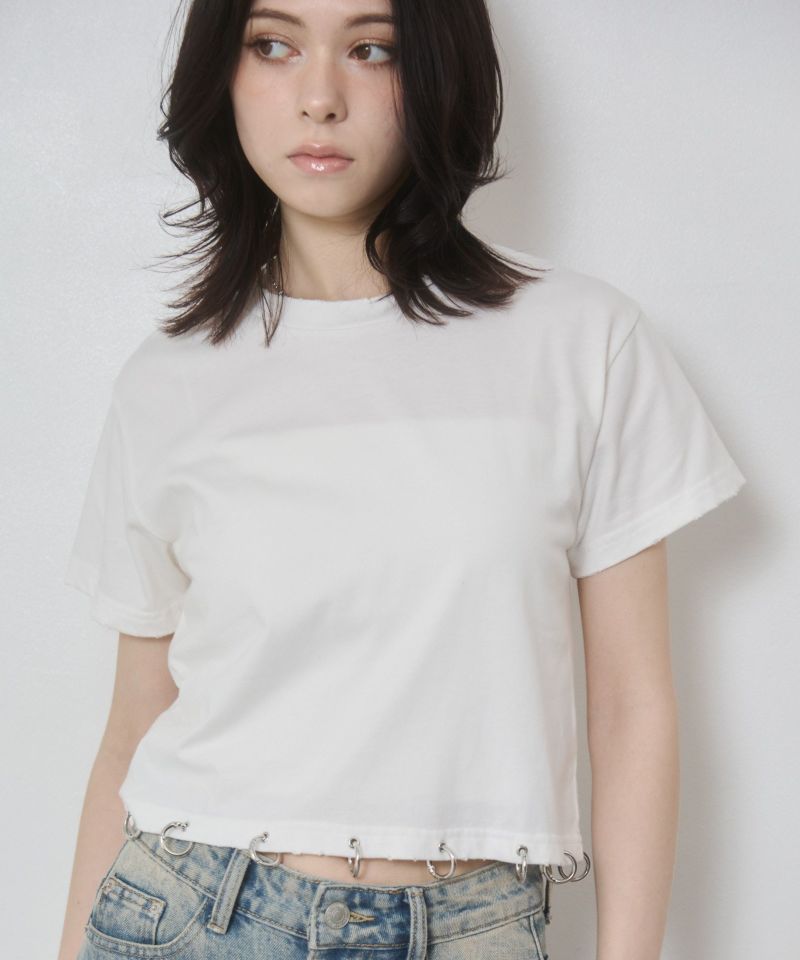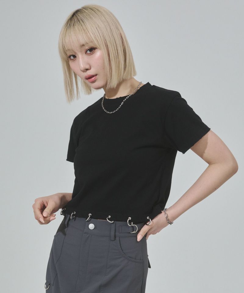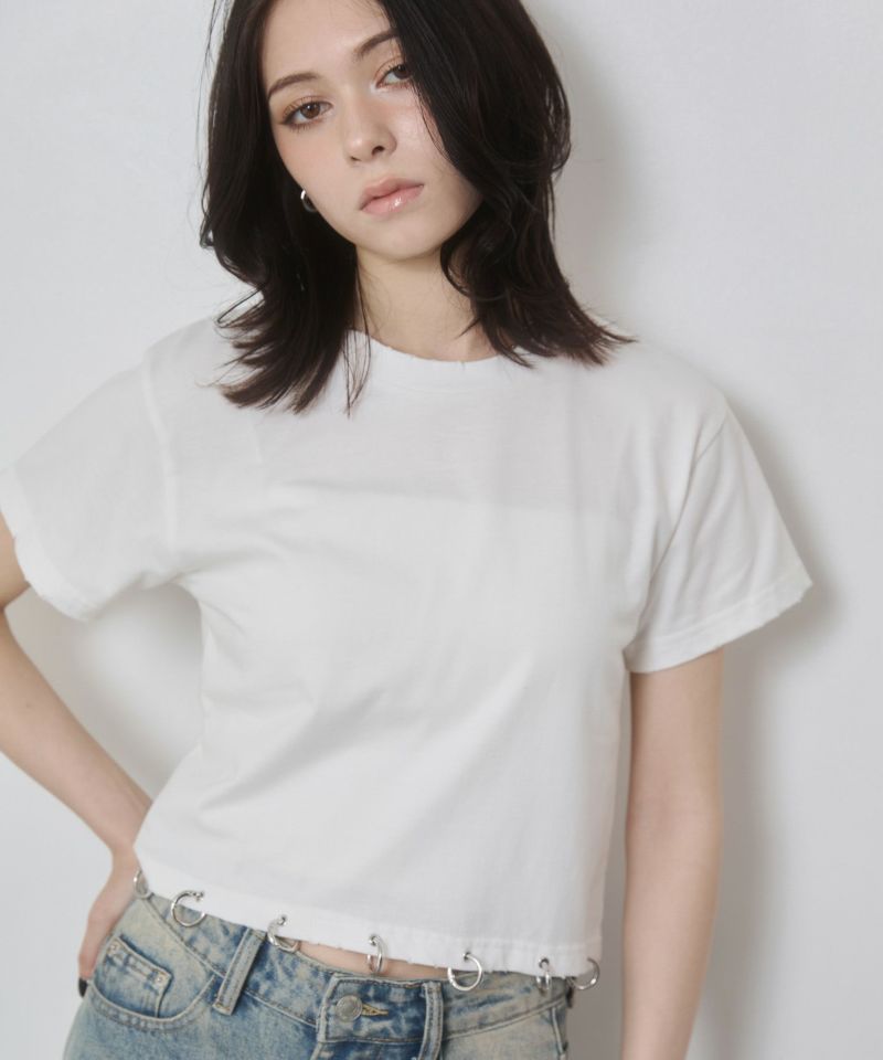 -------------------------------------------------- ■ポイント クールなデザインが魅力のTシャツ! ■ディティール シンプルながらも、裾のハトメとリングを付けたアクセいらずなTシャツ。 裾や袖口にはグラインダー加工を施しこなれ感のある雰囲気に。 程よくショート丈で合わせやすいサイズ感になっています。 ■スタイリング デニム合わせでカジュアルな着こなしがおすすめです。 ナイロンパンツ等でモードなスタイリングも大人っぽくなります。 --------------------------------------------------