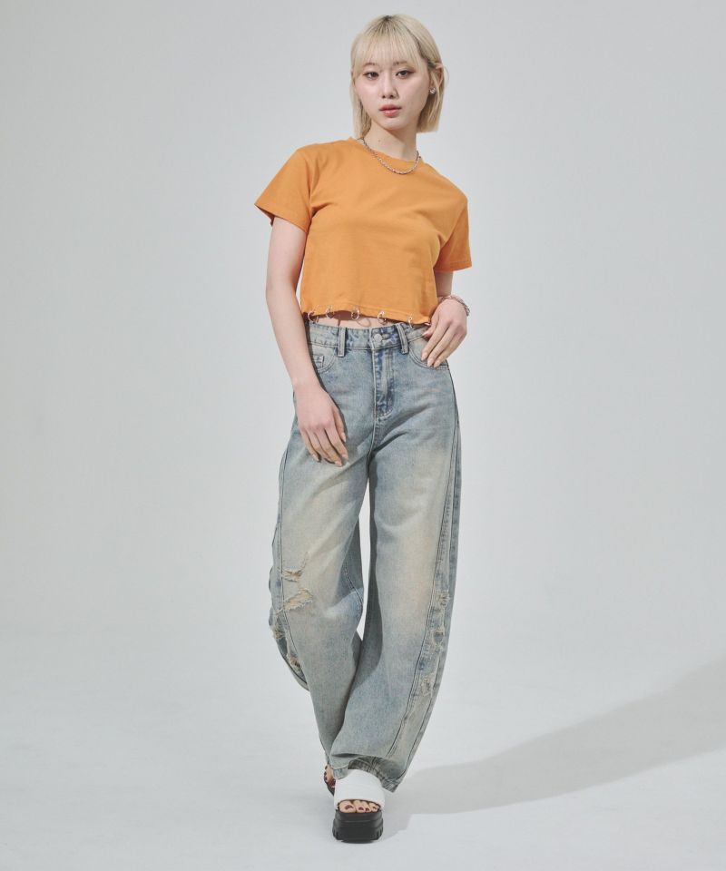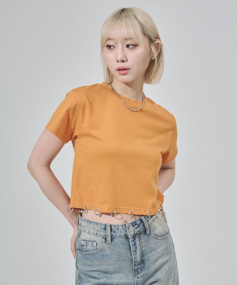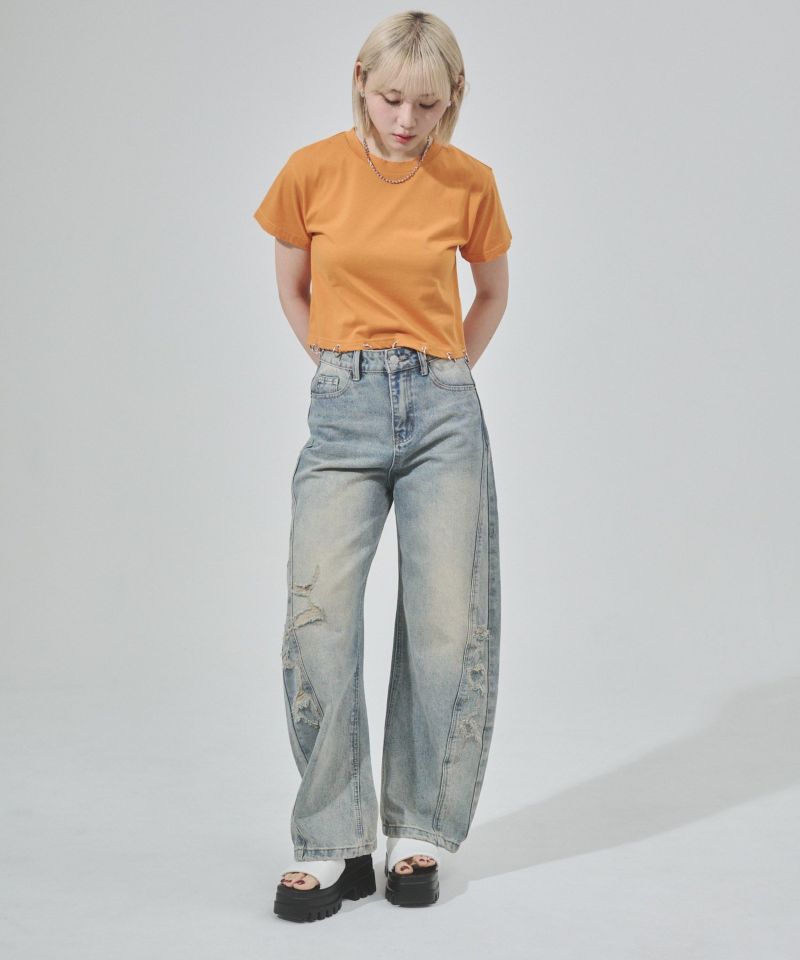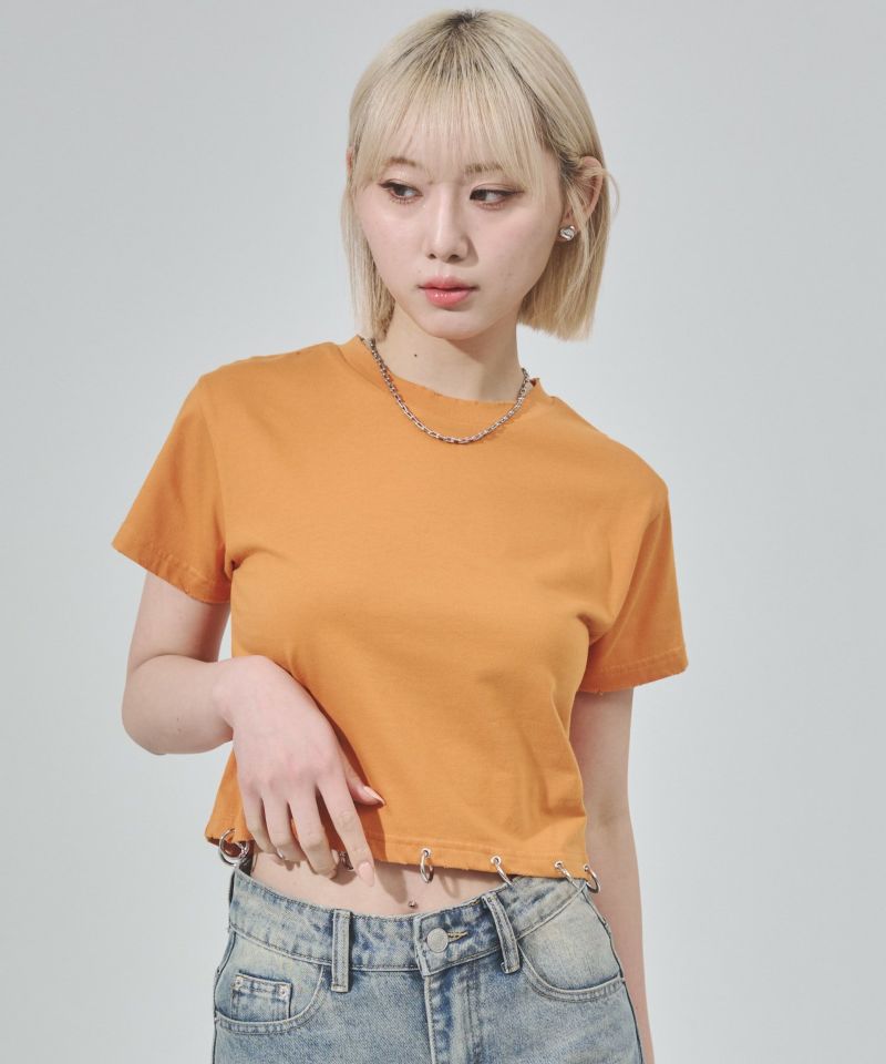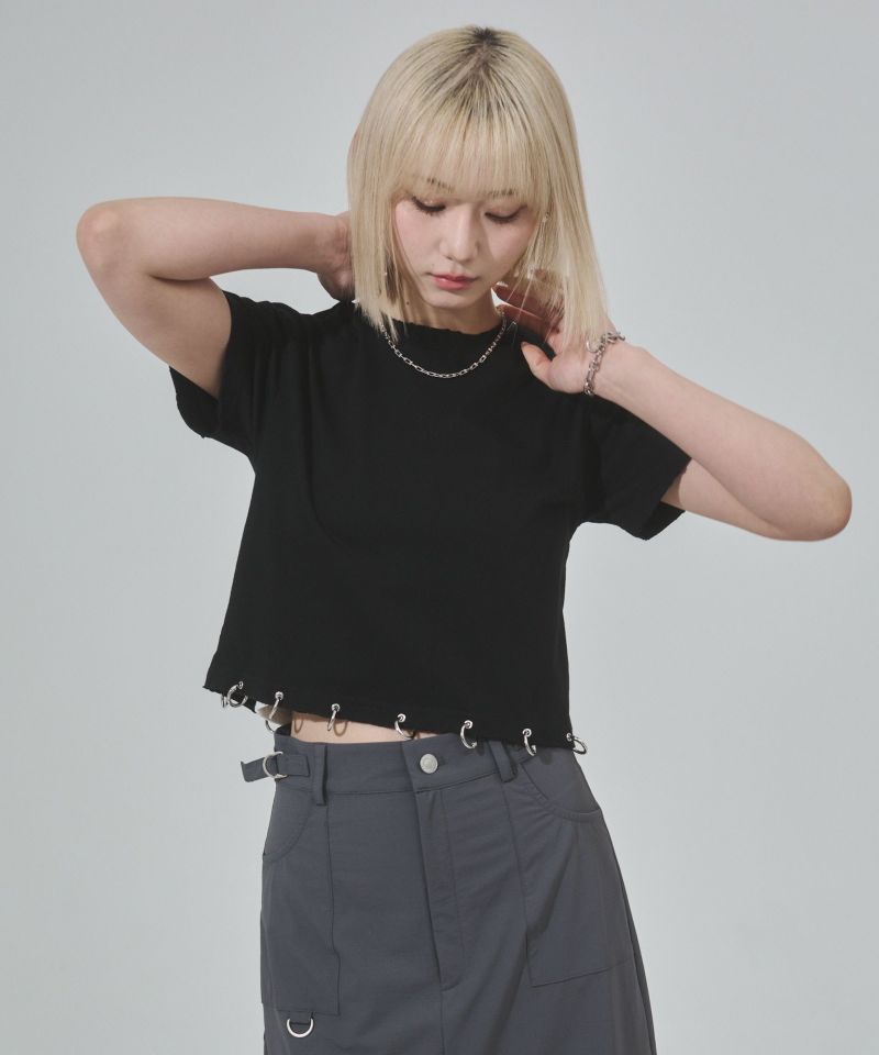 -------------------------------------------------- ■ポイント クールなデザインが魅力のTシャツ! ■ディティール シンプルながらも、裾のハトメとリングを付けたアクセいらずなTシャツ。 裾や袖口にはグラインダー加工を施しこなれ感のある雰囲気に。 程よくショート丈で合わせやすいサイズ感になっています。 ■スタイリング デニム合わせでカジュアルな着こなしがおすすめです。 ナイロンパンツ等でモードなスタイリングも大人っぽくなります。 --------------------------------------------------
