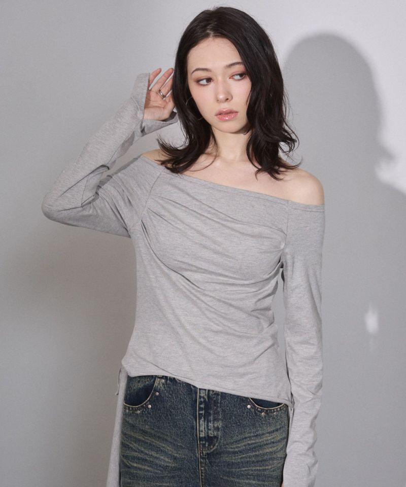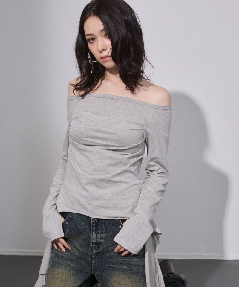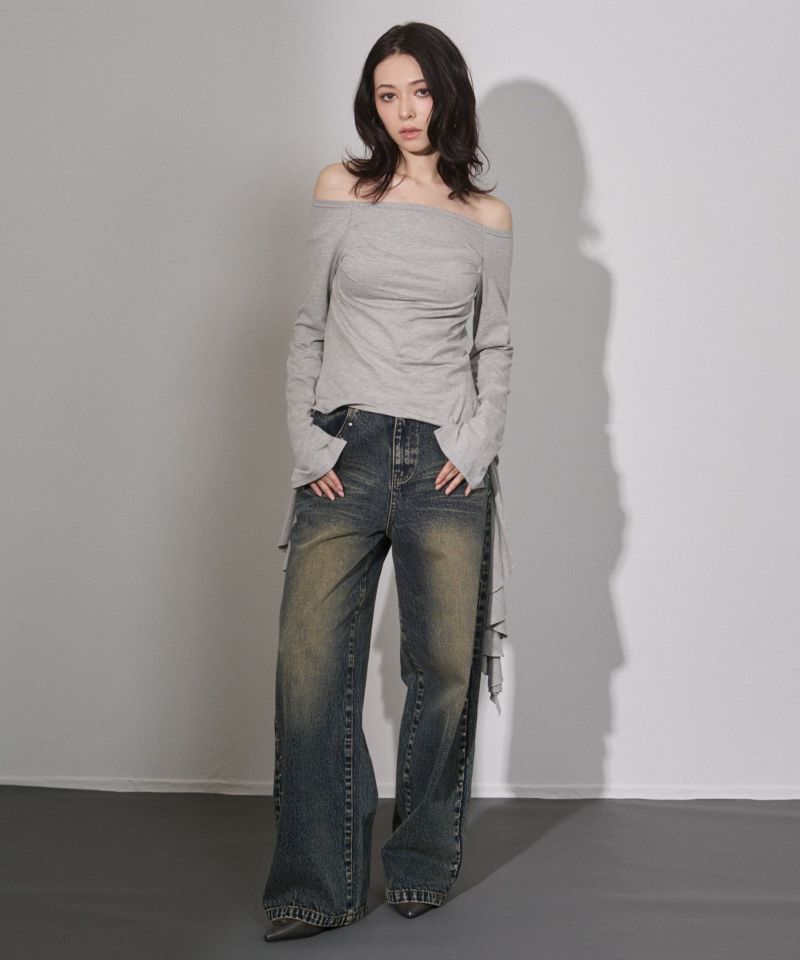 オフショルで着こなすときはあえてデニムパンツを合わせたバランスの良い着こなしが◎