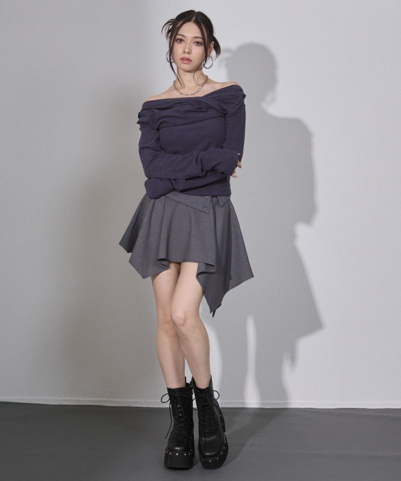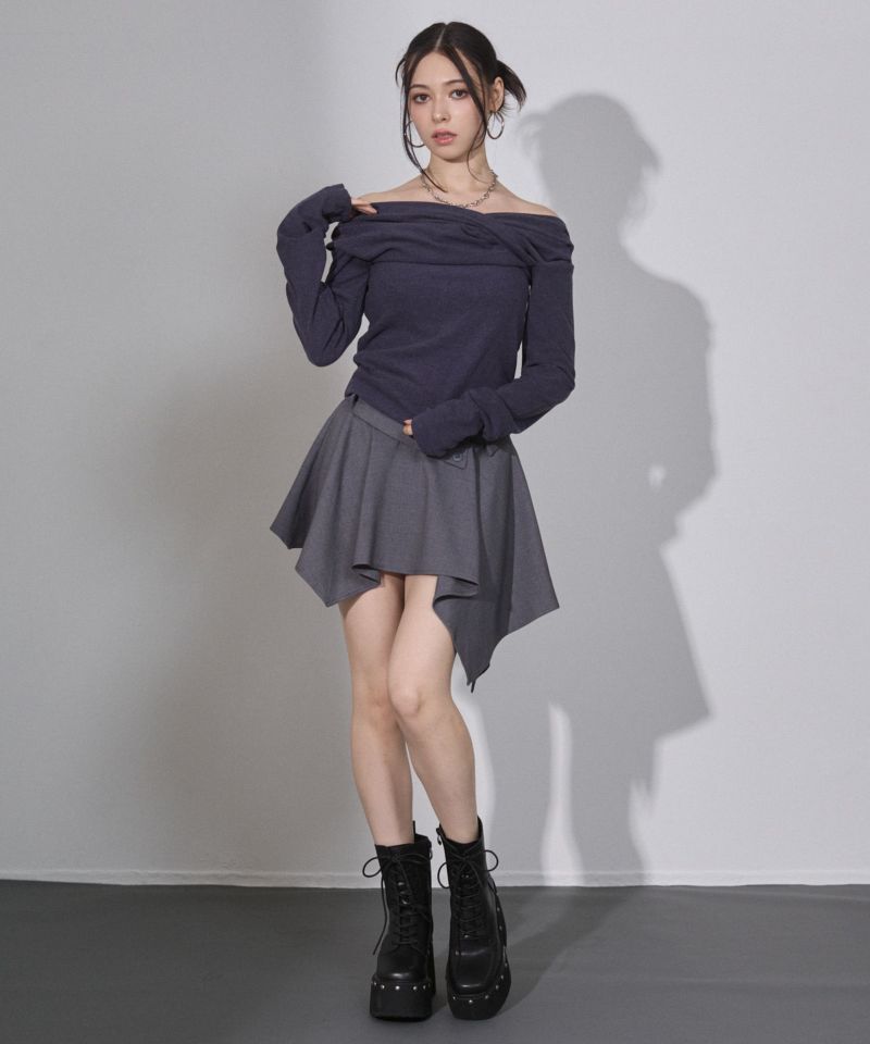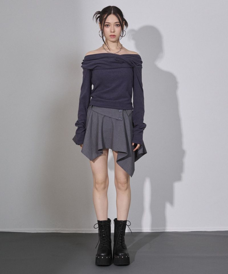 オフショルトップスや綺麗めのアイテムと合わせるとグッと大人っぽいスタイリングに。