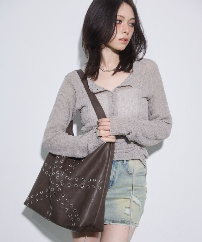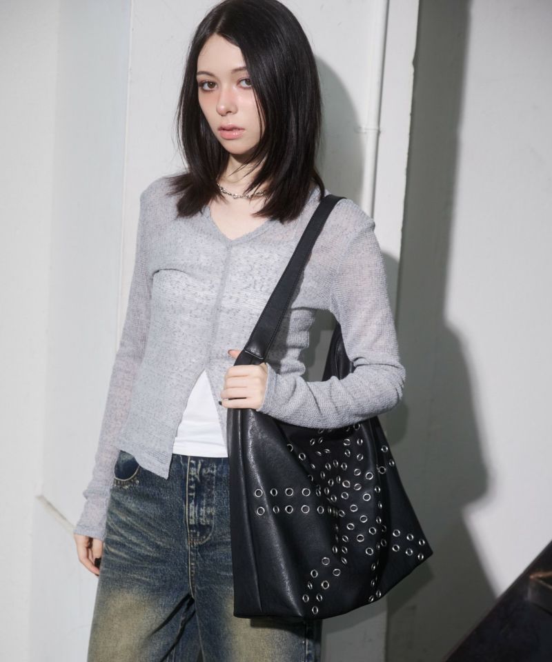 -------------------------------------------------- ■ディティール アイレットデザインがエッジが効いておりスタイリングのアクセントになるバッグ。 大きめのサイズ感で大容量なのも嬉しい。 中には内ポケットが2つ付いており、実用性もばっちりです。 --------------------------------------------------